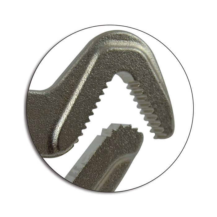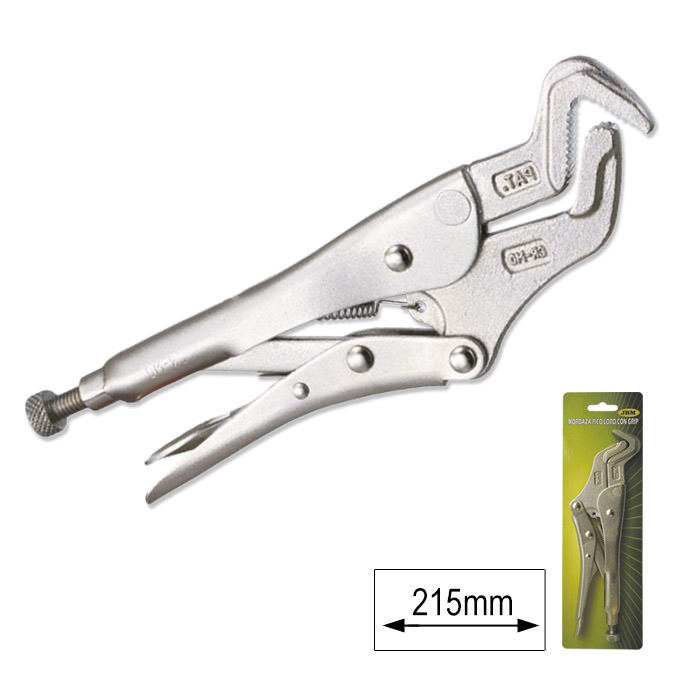 Alicate pico de loro curvado de 215mm. Pico dentado CR-MO Fuerte apriete en superficies circulares. Acabado en ángulo. Agarre a 6 medidas distintas de tuerca / tornillo hexagonal.