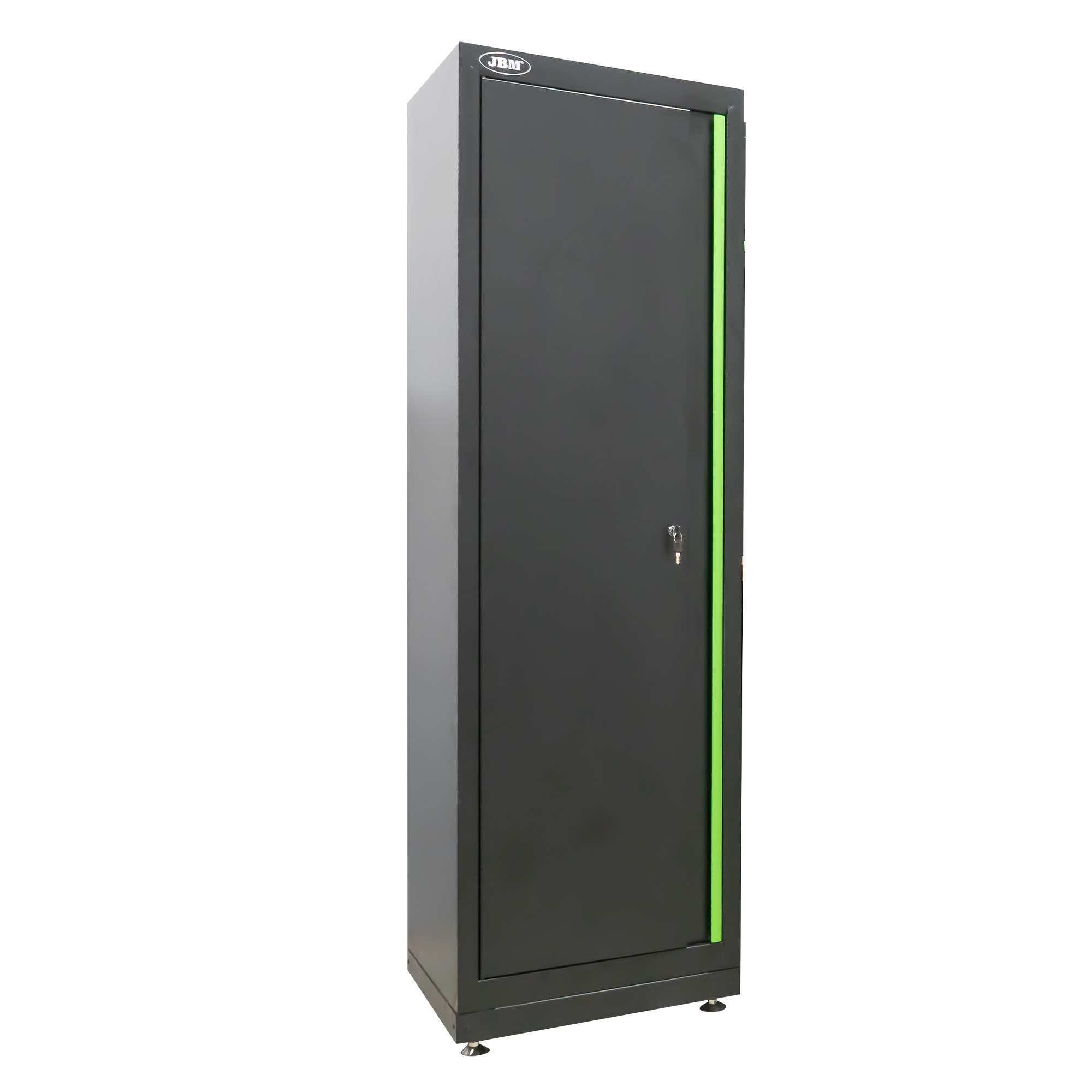 Armario alto diseñado con patas de altura ajustable, bombín y bandejas interiores. Su estructura versátil permite utilizarlo como estantería o espacio de almacenamiento vertical para herramientas, útiles y accesorios que requieran mayor capacidad.