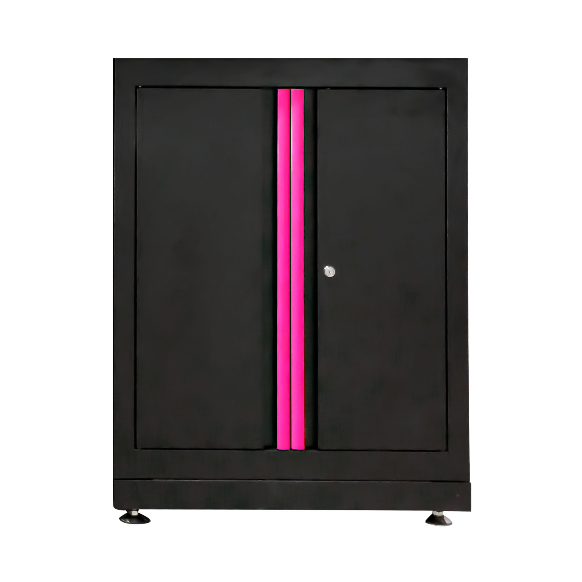 NUESTROS MUEBLES SE ENTREGAN DE SERIE CON TIRADORES VERDES. EN LOS MODELOS DISPONIBLES EN DISTINTOS COLORES, LOS TIRADORES SE SUMINISTRAN EN LOS TONOS CORRESPONDIENTES A CADA COMPONENTE SELECCIONADO. Armario con bombín, bandeja interior y dos puertas con rejillas. Incluye patas regulables en altura, ideal para almacenar herramientas y otros materiales de forma segura y organizada.