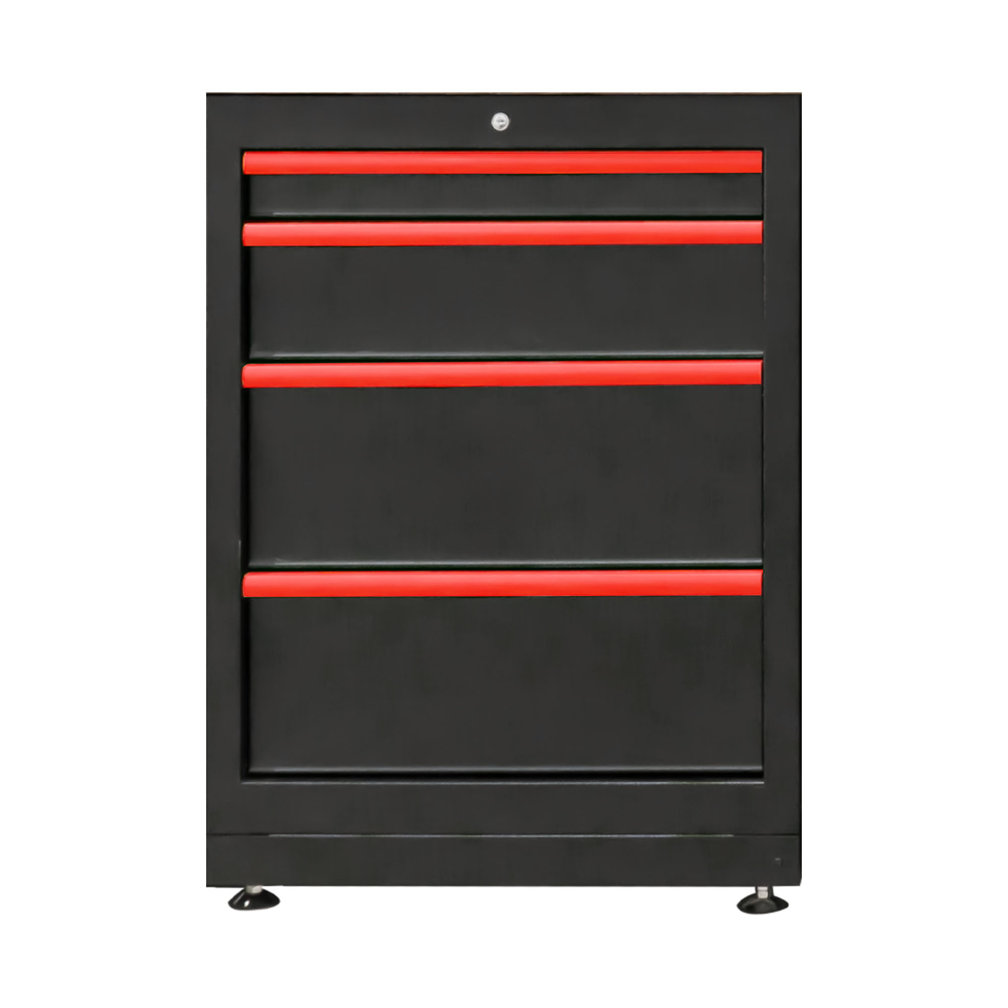 NUESTROS MUEBLES SE ENTREGAN DE SERIE CON TIRADORES VERDES. EN LOS MODELOS DISPONIBLES EN DISTINTOS COLORES, LOS TIRADORES SE SUMINISTRAN EN LOS TONOS CORRESPONDIENTES A CADA COMPONENTE SELECCIONADO. Armario tipo cajonera con 4 cajones de diferentes tamaños y usos, equipado con bombín y patas regulables en altura. Ideal para guardar herramientas y otros útiles de forma segura y ordenada.
