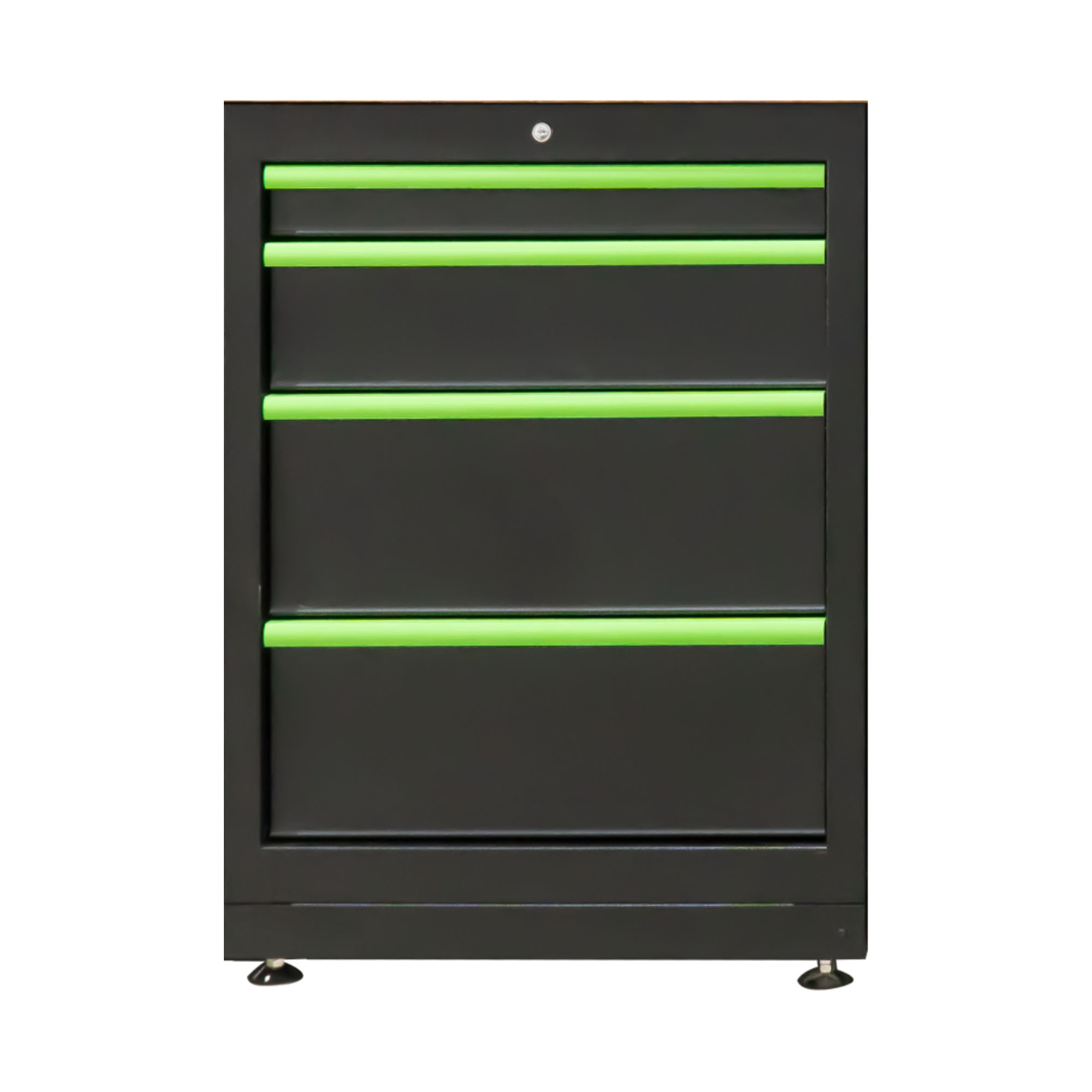 Armario tipo cajonera con 4 cajones de diferentes tamaños y usos, equipado con bombín y patas regulables en altura. Ideal para guardar herramientas y otros útiles de forma segura y ordenada.