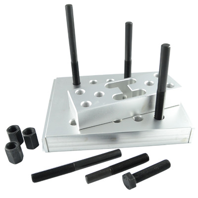 Soporte de prensa universal con agujeros roscados múltiples donde poder insertar las barras de soporte, y facilitar la extracción e instalación de rodamientos, cojinetes, casquillos de ruedas o silentblocks de brazos de suspensión o de componentes con superficies irregulares. La altura de las barras de soporte es regulable, los soportes de alineación laterales de seguridad y 3 puntos de sujeción evitan su deslizamiento, que, junto con el bloque espaciador, garantizan una sujeción segura y estable. Dimensiones bloque base de aluminio: 250x200x40mm Dimensiones bloque espaciador de aluminio: 200x70x40mm Barras de soporte: 110mm, 150mm (x2), 190mm (x2) Carga máxima: 30T Peso: 7.70kg Especificaiones: Bloque base de aluminio con 26 agujeros roscados Bloque espaciador de aluminio con 6 agujeros roscados y ranura giratoria en H 5 barras de soporte