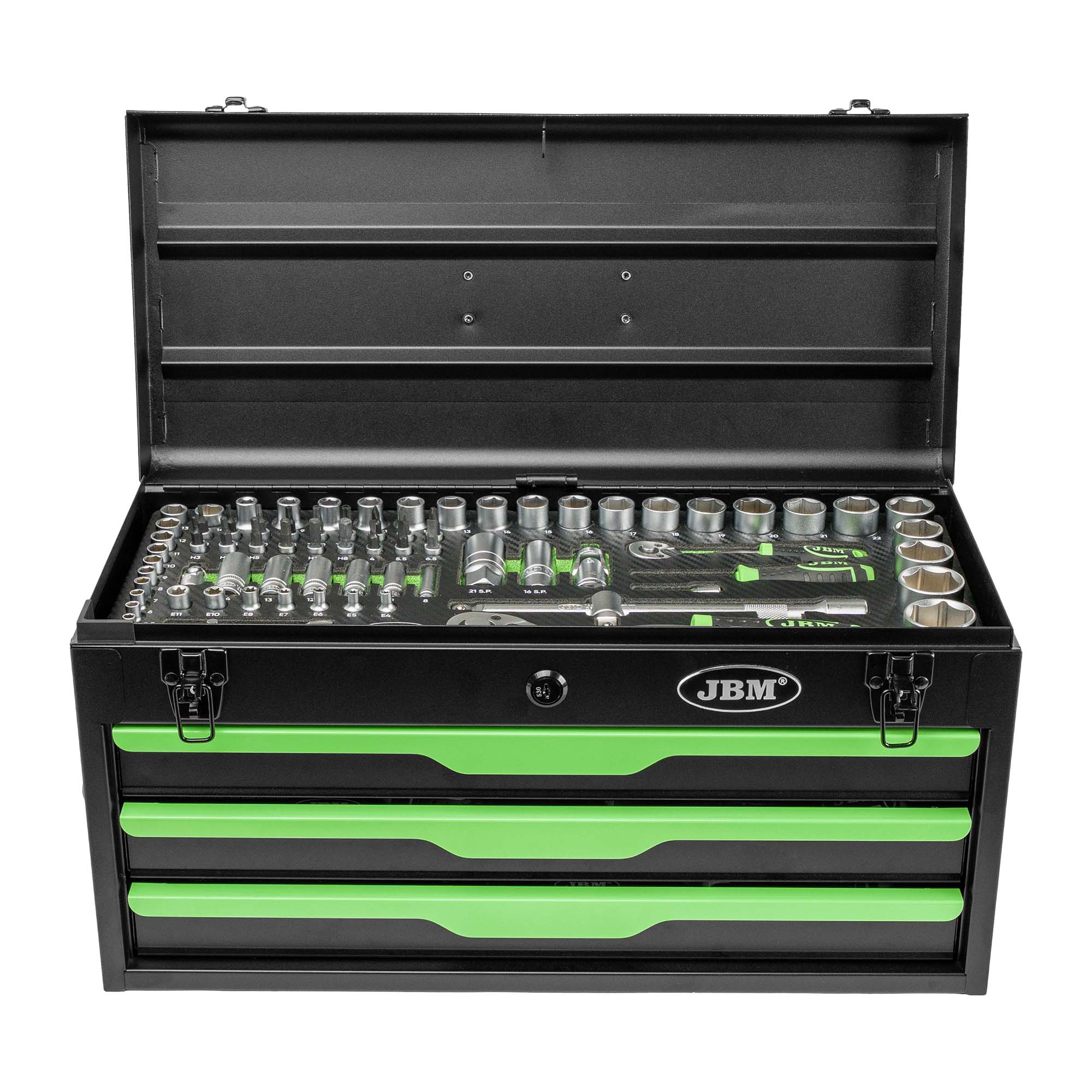El estuche contiene: Vasos Hexagonales 1/2″ · Vaso Hex: 8 mm, 9 mm, 10 mm, 11 mm, 12 mm, 13 mm, 14 mm, 15 mm, 16 mm, 17 mm, 18 mm, 19 mm, 20 mm, 21 mm, 22 mm, 23 mm (corto), 24 mm, 27 mm, 30 mm, 32 mm · Vasos Para Bujía 1/2″ · Vaso Bujía Hex: 16 mm, 21 mm · Vasos Hexagonales 1/4″ (Cincados) · Vaso Hex 1/4″: 4 mm, 4.5 mm, 5 mm, 5.5 mm, 6 mm, 7 mm, 8 mm, 9 mm, 10 mm, 11 mm, 12 mm, 13 mm, 14 mm · Vasos Hexagonales Largos 1/4″ (50 mm) · Vaso Hex Largo 1/4″: 8 mm, 10 mm, 11 mm, 12 mm, 13 mm, 14 mm · Vasos Torx 1/4″ (Tx) · Vaso Torx 1/4″: E4, E5, E6, E7, E8 · Vasos Torx (Tx) · Vaso Torx: E10, E11 Carracas · Carraca 1/2″: 72 dientes, 255 mm (cincada) · Carraca 1/4″: 72 dientes, 145 mm (cincada) Barras De Extensión · Barra Extensión 1/2″: 125 mm, 250 mm · Barra Extensión 1/4″: 50 mm, 100 mm Articulaciones Universales · Articulación Universal: 1/2″, 1/4″ · Adaptadores · Adaptador 3/8″ hembra – 1/2″ macho inviolable Vasos Destornillador Hexagonal 1/4″ · Vaso Destornillador Hex: 3 mm, 4 mm, 5 mm, 6 mm · Vaso Con Punta 1/4″ Hexagonal: 7 mm, 8 mm Vasos Destornillador Planos (Sl) · Vaso Destornillador Plano: 4 mm, 5.5 mm, 6.5 mm · Vasos Destornillador Estrella (Ph) · Vaso Destornillador Ph: 1, 2, 3 · Vasos Destornillador Torx (Tx) Involutos · Vaso Destornillador Torx Inv: T10, T15, T20, T25, T30, T40 Mangos Y Accesorios Destornillador · Mango Corredizo (T) 1/4″ · Mango Destornillador 1/4″ · Destornillador Imantado · Punta Imantada Extensible Llaves Combinadas · Llave Combinada: 6 mm, 7 mm, 8 mm, 9 mm, 10 mm, 11 mm, 12 mm, 13 mm, 14 mm, 17 mm, 19 mm, 22 mm · Llaves Acodadas De 2 Bocas Estrella · Llave Acodada Estrella: 6×7 mm, 8×9 mm, 10×11 mm, 12×13 mm, 14×15 mm, 16×17 mm, 18×19 mm, 20×22 mm Destornilladores Planos · Destornillador Plano: Sl5x75 mm, Sl6x100 mm, Sl8x150 mm, Sl10x200 mm · Destornilladores Estrella · Destornillador Ph: Ph1x80 mm, Ph2x100 mm, Ph3x150 mm Alicates · Alicate Ajustable 240 mm · Alicate Universal 7″ (180 mm) · Alicate Punta Alargada 8″ (200 mm) · Alicate Corte Diagonal 7″ (180 mm) · Alicate Mordaza De Presión Otros · Llave Para Caja De Herramientas Metálica Ref. 54261 · Set De 32 Puntas