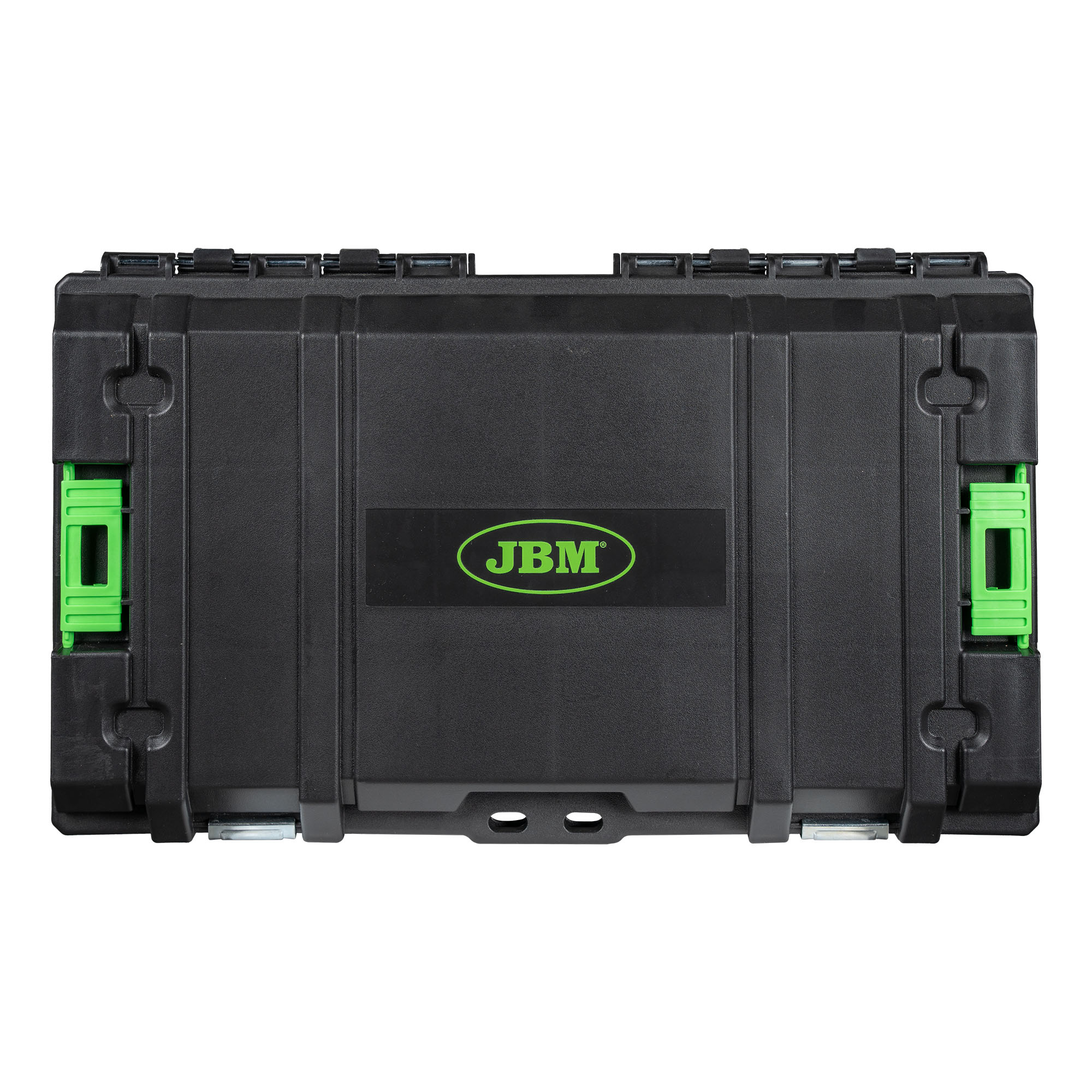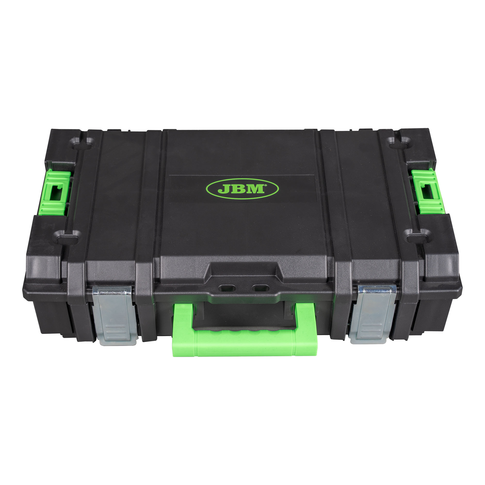 Esta caja cuenta con dos organizadores con múltiples compartimentos para oreganizar y clasificar una gran variedad de herramientas. Dispone de junta en la unión para asegurar un cierre hermético.