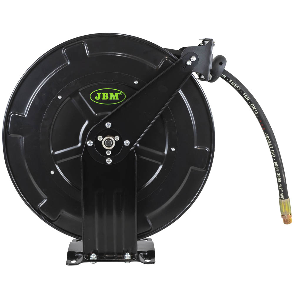Este carrete para manguera de aceite está diseñado para facilitar el manejo seguro y eficiente del suministro de aceite en entornos industriales o talleres. Fabricado en acero resistente, garantiza durabilidad y resistencia a las condiciones de trabajo más exigentes. Características principales: · Longitud de la manguera: 15 + 1 metros, proporcionando un alcance amplio para diversas aplicaciones. · Presión máxima de trabajo: 2450 PSI, ideal para sistemas que requieren alta presión. · Conexiones de entrada y salida: ½” BSPT, compatibles con una amplia gama de sistemas industriales. · Material: Estructura robusta de acero que asegura una larga vida útil y resistencia al desgaste. · Ideal para suministrar, transferir o evacuar a larga distancia aceites de motor, combustibles diésel, lubricantes, agua, aceite usado y aire.