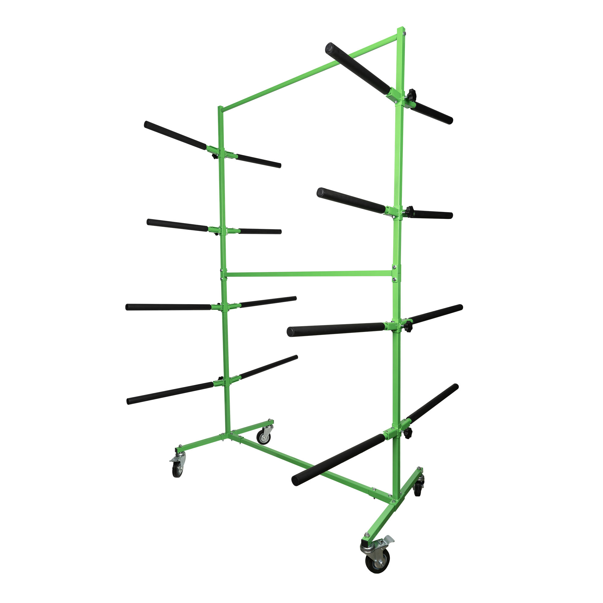 Estante de carga y almacenamiento de parachoques móvil de doble cara. Su diseño compacto con 8 pares de soportes ajustables en altura con espuma y ruedas con freno lo convierten en una opción muy versátil para el taller de carrocería.