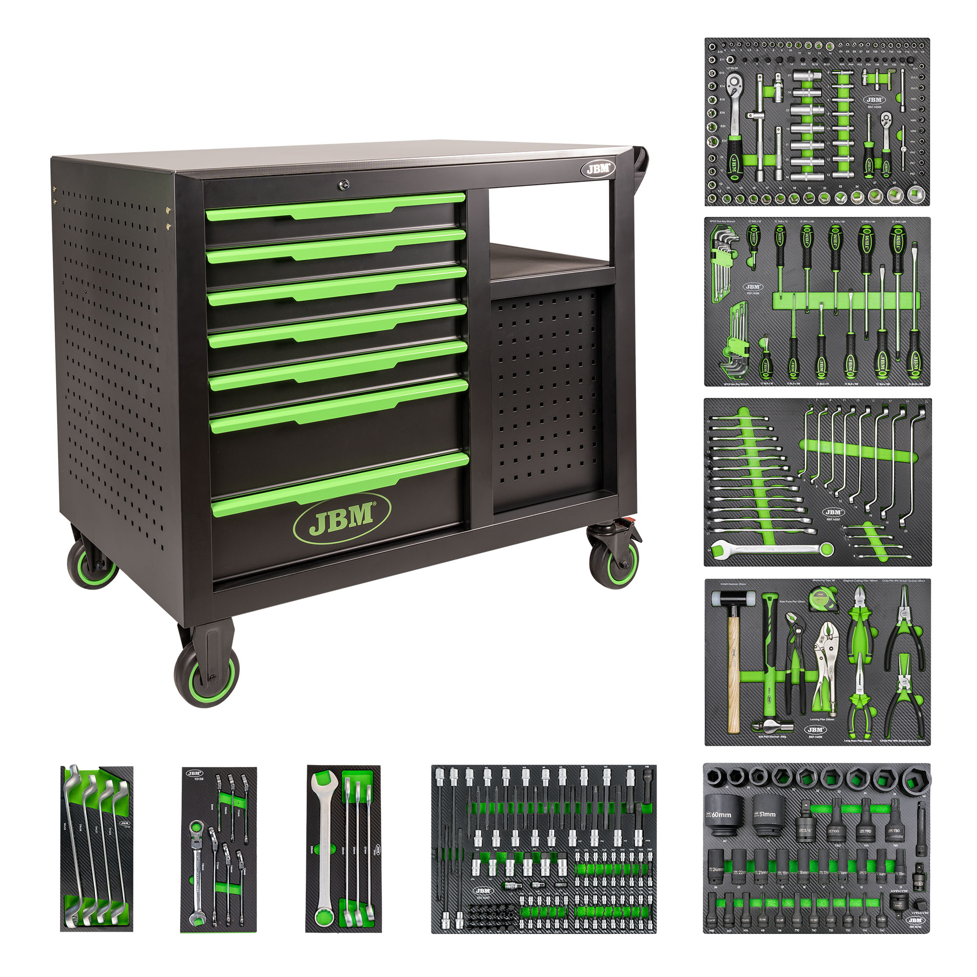 INCLUYE: Ref: 14296 MÓDULO 108 PIEZAS CON VASOS HEXAGONALES con acabado de fibra de carbono Ref: 14297 MÓDULO EVA DE 25 LLAVES COMBINADAS Ref :14298 MÓDULO EVA DE DESTORNILLADORES Y LLAVES HEGAXONALES Ref: 14299 MÓDULO EVA DE MARTILLOS Y ALICATES Ref: 15156 MÓDULO EVA DE 4 LLAVES ACODADAS Ref: 15158 MÓDULO EVA DE 7 LLAVES ARTICULADAS Ref: 15161 MÓDULO EVA DE 4 LLAVES FIJAS Ref: 15736 MÓDULO EVA DE VASOS DE IMPACTO Ref: 15681 MÓDULO EVA DE PUNTAS ESPECIFICACIONES TÉCNICAS – Tamaño de la caja: 1185x780x1090mm – Tamaño del carro: 1131x720x998mm – Tamaño de los cajones: – Cajones grandes: 569x400x154mm (x4) – Cajones pequeños: 569x400x75mm (x7) DESCRIPCIÓN DEL PRODUCTO · 1.0mm de acero para el marco y 0.8mm para los cajones. · Acabado en pintura en polvo de grano negro. · Guías de bolas de 45 mm de ancho con retorno automático. · Encimera de acero inoxidable de 18 mm y alfombrillas de cajón de 2,5 mm. · Tiradores de cajón metálicos con placas de identificación. · Paneles perforados con agujeros cuadrados. · Dos estantes fijos en la parte trasera. · 5×2 pulg. Ruedas de TPR, 2 giratorias bloqueables y 2 rígidas. Embalaje: Cartón marrón de 5 capas + bolsa de PE + palet de madera Con 4 módulos acabados en fibra de carbono.