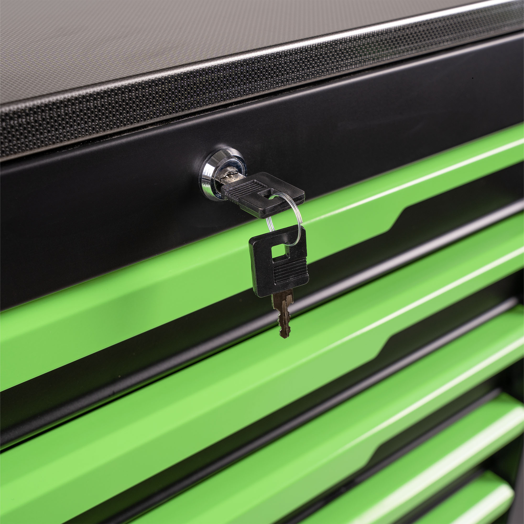 DISEÑO: · 1.0mm de acero para el marco y 0.8mm para los cajones · Acabado en pintura en polvo de grano negro · Guías de bolas de 45 mm de ancho con retorno automático. · Encimera de acero inoxidable de 18 mm y alfombrillas de cajón de 2,5 mm · Tiradores de cajón metálicos con placas de identificación · Paneles perforados con agujeros cuadrados · Dos estantes fijos en la parte trasera · 5×2 pulg. Ruedas de TPR, 2 giratorias bloqueables y 2 rígidas ESPECIFICACIONES TÉCNICAS – Tamaño de la caja: 1185x780x1090mm – Tamaño del carro: 1131x720x998mm – Tamaño de los cajones: – Cajones grandes: 569x400x154mm (x4) – Cajones pequeños: 569x400x75mm (x7)
