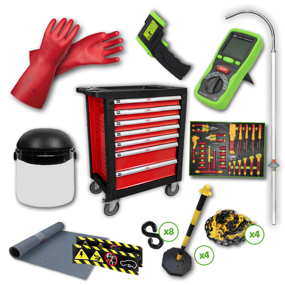 Carro especialmente configurado para cubrir todas las necesidades básicas derivadas del mantenimiento y reparación de vehículos híbridos y eléctricos, así como para trabajos en alta tensión.
