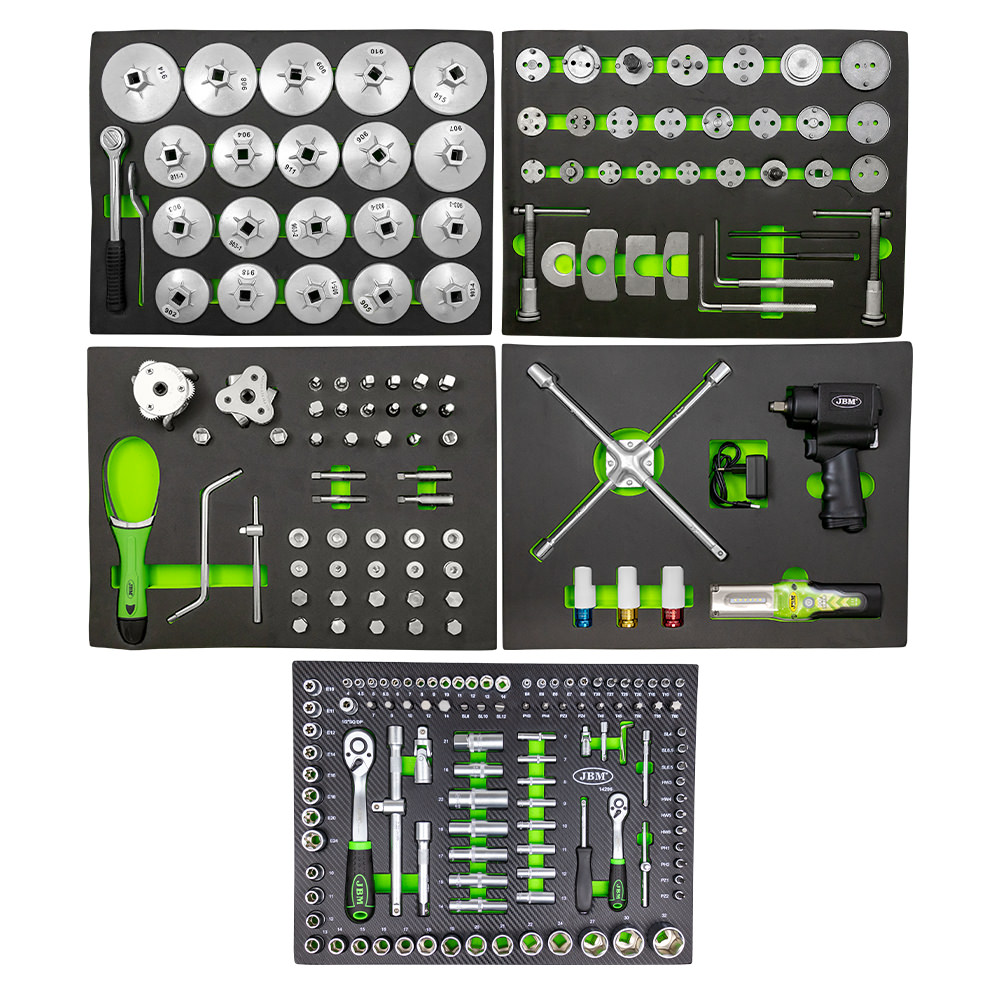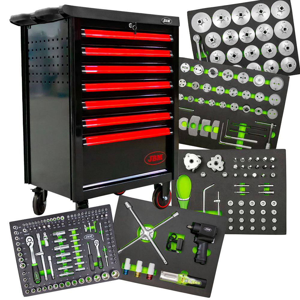 Carro de herramientas, especial con todas las herramientas para el mantenimiento del vehículo. Esquinas protegidas con goma muy resistente. Superficie de goma antideslizante. Cierre con llave. Cajones con marcadores de contenido. Incluye bandeja portasprays Cerradura individual. Medidas exterior: ancho 470 / largo 700 / alto 970mm Medidas interior: Cajones pequeños (x5): ancho 400 / largo 535 / alto 60mm Cajón mediano (x1): ancho 400 / largo 535 / alto 130mm Cajón grande (x1): ancho 400 / largo 535 / alto 200mm Contenido: Módulo 1: Extractores de filtro de aceite (22PCS): 20x extractores para filtros de aceite. 1x trinquete de 1/2″. 1x llave hexagonal. Módulo 2: reposicionadores de pistón de freno (34PCS): 24x adaptadores. 4x placas de retención. 2x ejes para roscar. 2x punzones. 2x llaves hexagonales. Módulo 3: reparación de tapones Carter y extractores de filtro de aceite ajustables (86PCS): 1x llave tapón Carter 8 x 10mm. 1x extractor de filtro aceite pata plana 57-125mm. 1x extractor de filtro aceite redonda 69-135mm. 1x extractor de filtros ajustable 65-105mm 110-155mm. 9x vasos cuadrados 1x vaso cuadrado hembra. 1x vaso triángulo 6x vasos hexagonales. 1x mango corredizo+ corredera de 165mm. 4x brocas. 20x tapones. 40x arandelas. Módulo 4: pistola y vasos de impacto (6PCS): 3x vasos de impacto especial extracción ruedas 17-21mm. 1x llave en cruz unión soldada. 1x pistola de impacto nano 1/2″ 1356Nm. 1x portátil de taller 300Lm. Módulo 5: 108 piezas con vasos hexagonales: 1x carraca universal ½» de 72 dientes con expulsador de vaso 1x adaptador de cabezales 1/2″ x 5/16″ 5x vasos métricos largos ½» 17x vasos métricos ½» 8x vasos torx ½» 2x vasos de bujía ½» 2x barras de extensión de 5″ y 10″ 1x articulación universal de 1/2″ 1x adaptador 3/8″H – 1/2″M 1x carraca universal ¼» de 72 dientes con expulsor de vaso 18x cabezales para destornillador (puntas PH/PZ/HEX/SL/TX) 1x mango destornillador ¼» 1x articulación universal ¼» 1x mango corredizo de ¼» 2x barras de extensión de 2″ y 3″ 13x vasos métricos 8x vasos largos ¼» 5x vasos torx ¼» 17x cabezales (8 mm: HEX/SL/PH/PZ/TX) 3x llaves allen
