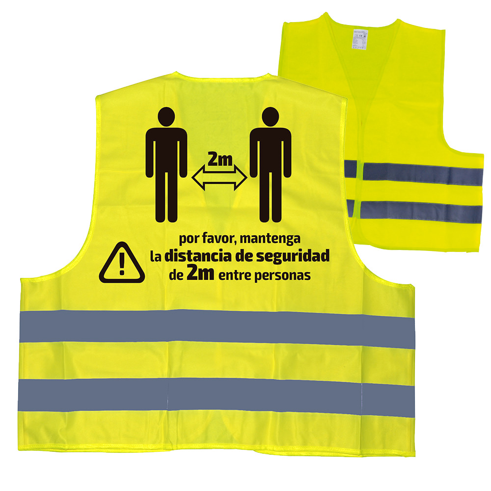 Chaleco de protección de alta visibilidad, homologado. Incluye mensaje de advertencia de mantener la distancia de seguridad de 2m entre personas. Chaleco de prevención COVID.