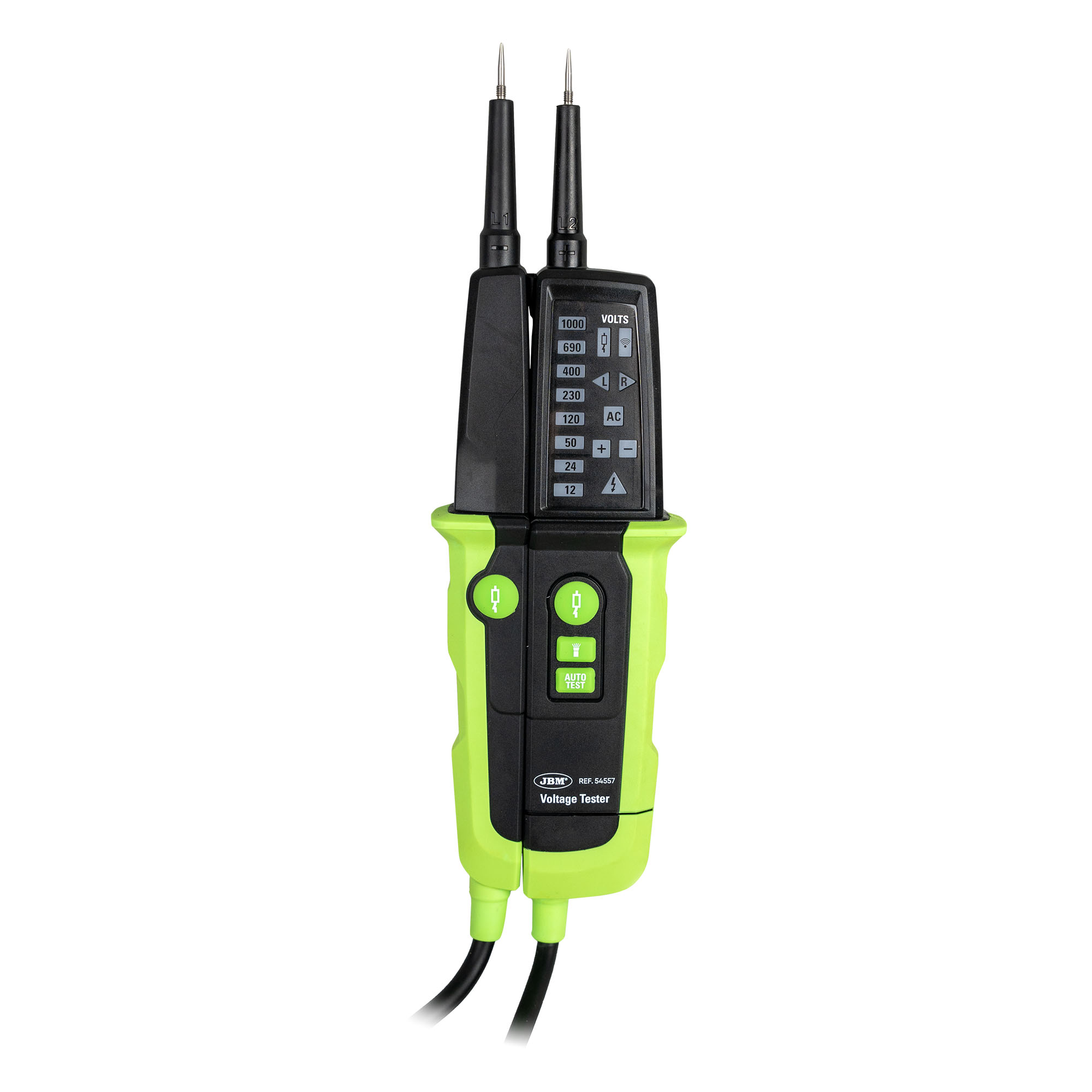 Este dispositivo portátil está diseñado para medir la tensión eléctrica en circuitos, tomas de corriente, cables y otros dispositivos eléctricos. Con su pantalla digital y sus sondas de medición, el comprobador de voltaje, proporciona lecturas precisas de la tensión. ESPECIFICACIONES TÉCNICAS: Rango de voltaje del LED 12V a 1000V CA/CC Resolución del LED ±12,24,50,120,230,400,690,1000V CA/CC Tolerancias Cumple con EN 61243-3:2014 Rango de frecuencia 0/40Hz a 400Hz Tiempo de respuesta ≤1 segundo Encendido automático Encendido automático ≥12V CA/CC Detección de voltaje Automático Detección de polaridad Rango completo Detección de rango Automático Impedancia básica de carga interna Máximo 3.5 mA a 1000 V Corriente máxima instantánea 350 ΚΩ / Is<3.5 mA (sin disparo de RCD) Tiempo de funcionamiento 30 segundos Tiempo de recuperación 240 segundos Prueba de continuidad 0 a 400 ΚΩ Precisión Resistencia nominal +50% Corriente de prueba ≤5 µA Carga conmutable ~ 7 ΚΩ Corriente máxima instantánea Is (carga)= 150mA Disparo del RCD ~ 30mA@230V Fase de polo único 100V a 1000V CA RANGO DE FRECUÉNCIA: Indicación de campo giratorio Indicación de campo giratorio Rango de voltaje (LED) 100-1000V Rango de frecuencia 50/60Hz Principio de medición Electrodo de polo doble y contacto