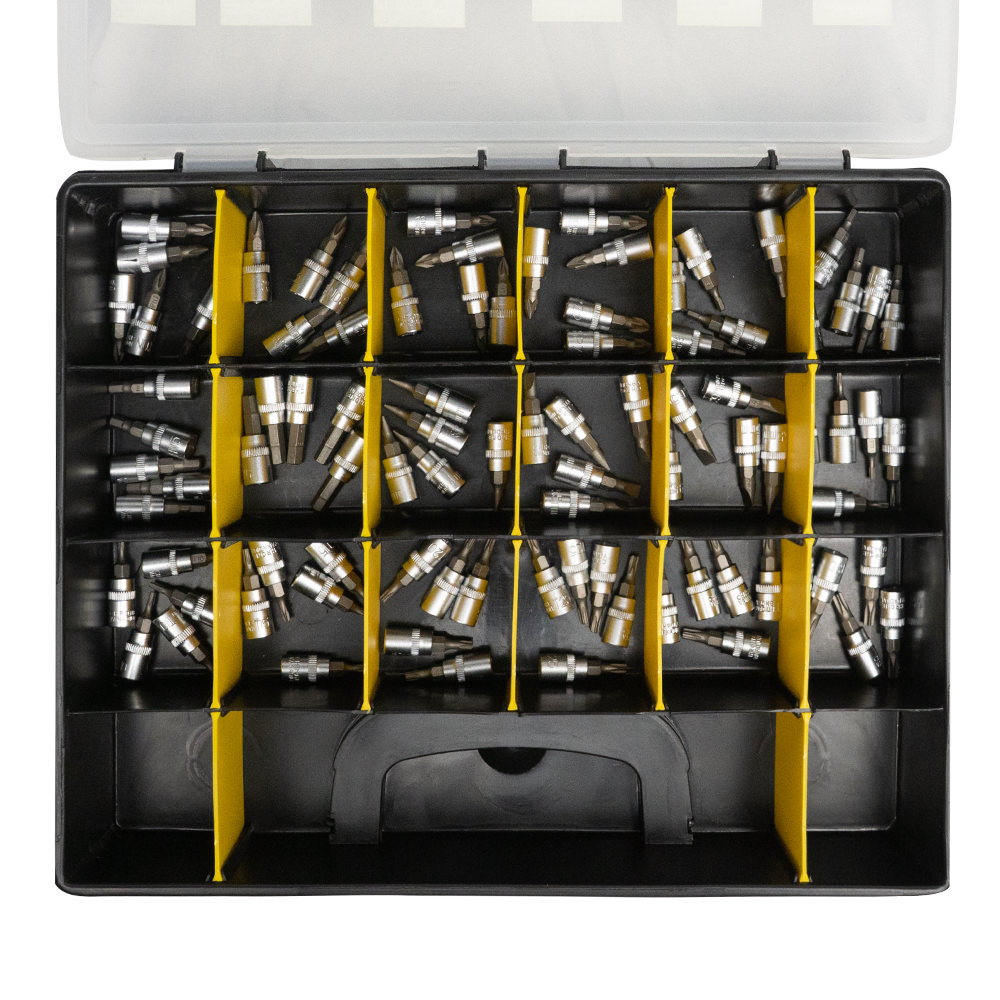 El estuche contiene: Vaso Destornillador Phillips (Ph): 1, 2 Vaso Destornillador Pozidriv (Pz): 1, 2 Vaso Destornillador Hexagonal (Hex): 3, 4, 5, 6 mm Vaso Destornillador Plano (Sl): 4, 5.5, 6.5 mm Vaso Destornillador Torx (Tx): T8, T10, T15, T20, T25, T27, T30