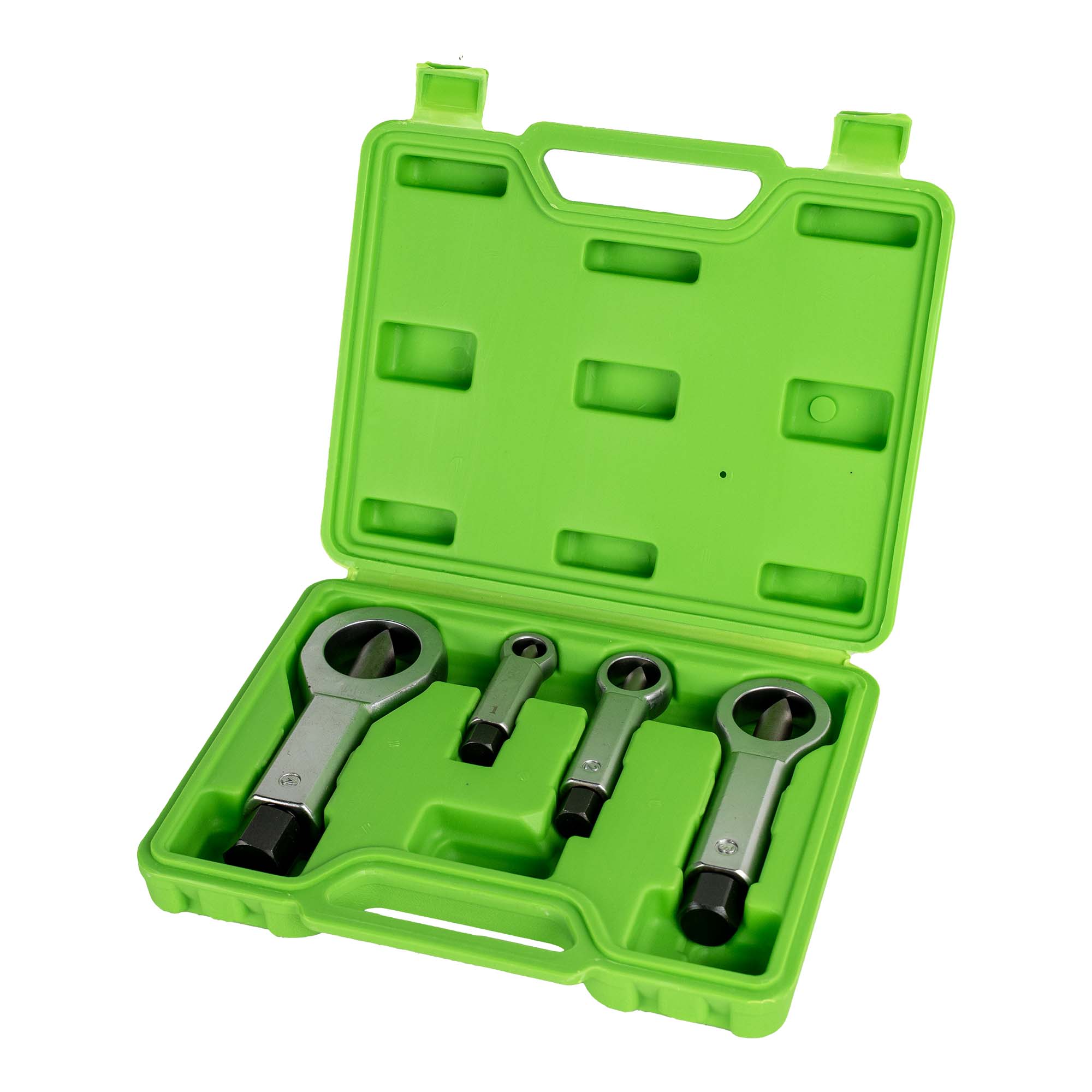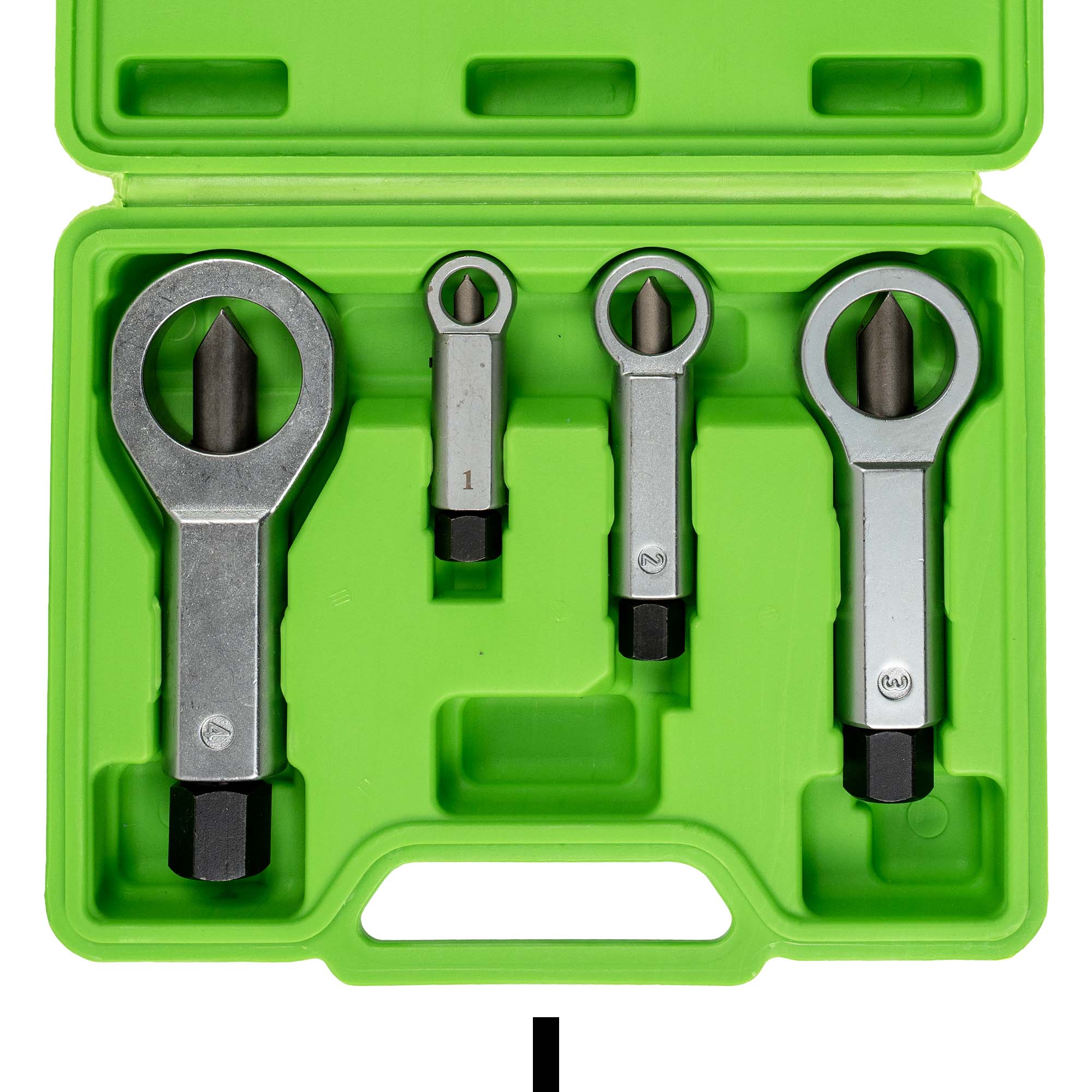 Juego de 4 llaves que permiten romper todo tipo de tuercas. Funciona atornillando la llave: con unas pocas vueltas permite una extracción segura de tuercas corroídas, oxidadas o dañadas sin dañar el hilo del perno. Tamaños: de 9 a 12mm, de 12 a 16mm, de 16 a 22mm, de 22 a 27mm. Con despiece disponible: ref. 14049: 9-12mm ref. 14050: 12-16mm ref. 14051: 16-22mm ref. 14052: 22-27mm