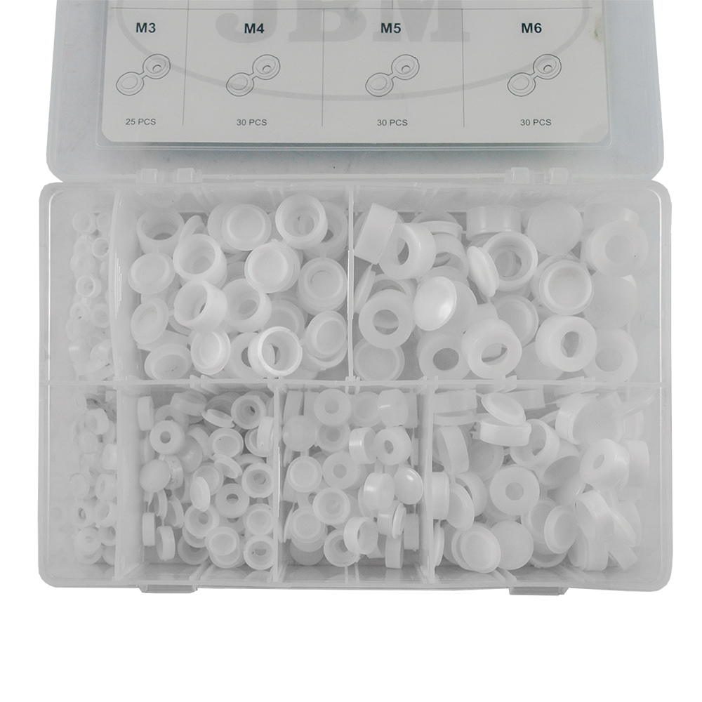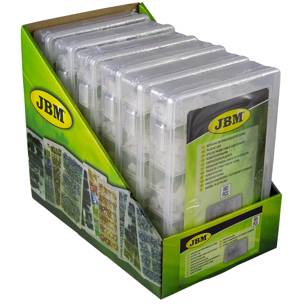 Estuche de 180 piezas. Contiene: M2 (25pcs) M3 (25pcs) M4 (30pcs) M5 (30pcs) M6 (30pcs) M8 20pcs) M10 (20pcs) Disponible en expositor con 6 estuches.
