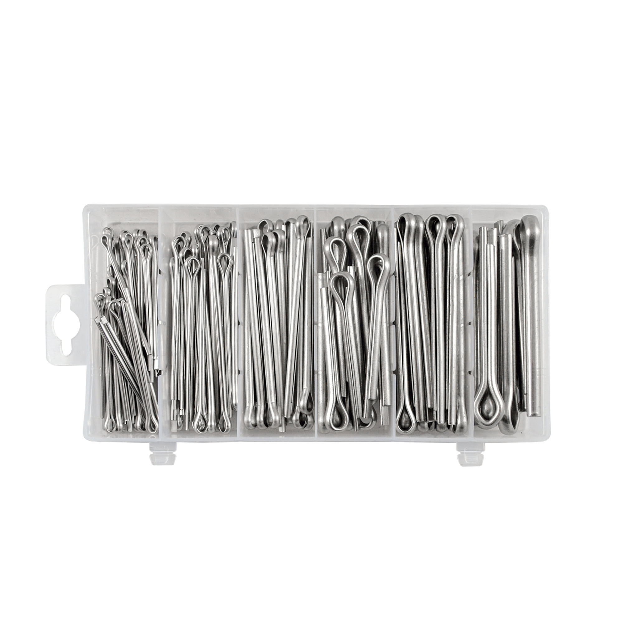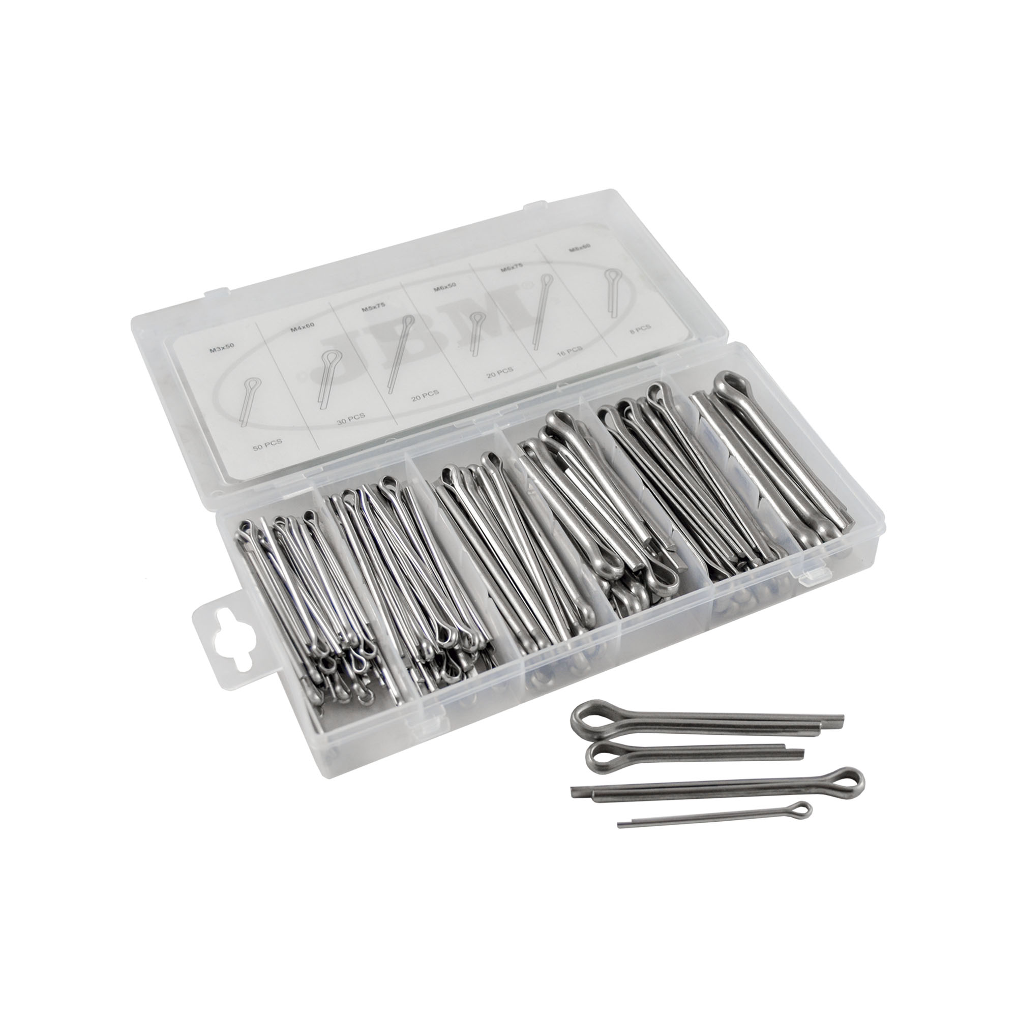 Estuche de 144 pasadores( acero inoxidable ) . Contiene: M3x50 (50pcs) M4x60 (30pcs) M5x75 (20pcs) M6x50 (20pcs) M6x75 (16pcs) M8x60 (8pcs) Disponible en caja expositor de 6 unidades.