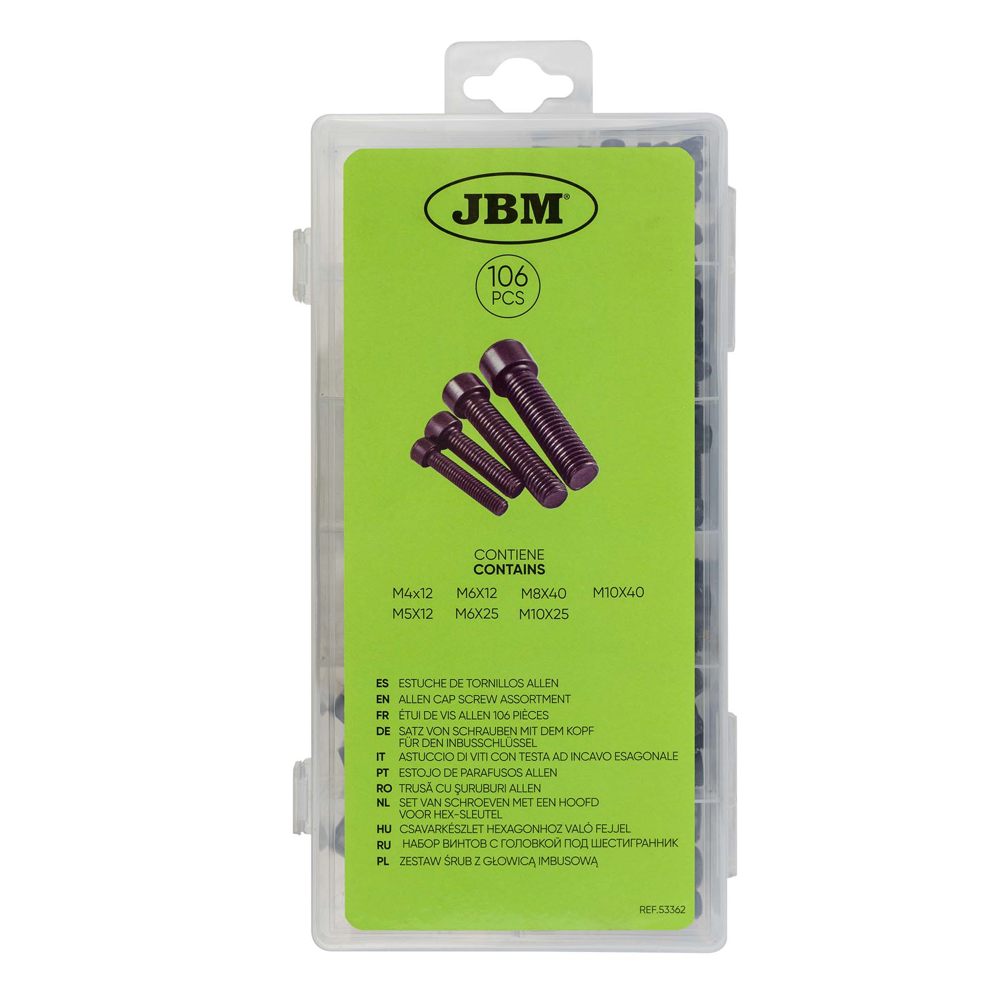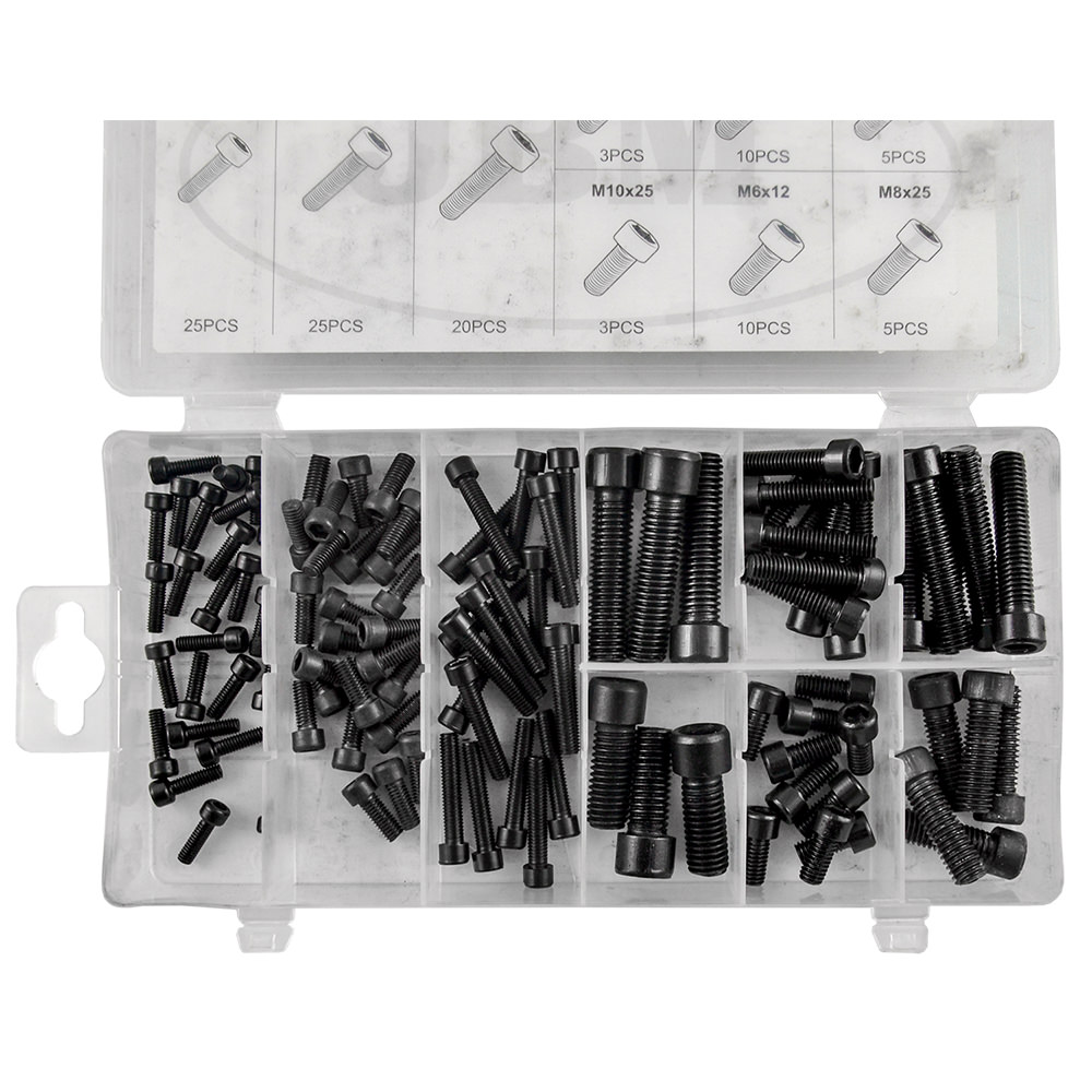 Estuche de 106 tornillos allen. Contiene: 4×12 (25pcs) 5×12 (25pcs) 5×25 (20pcs) 10×40 (3pcs) 6×25 (10pcs) 8×40 (5pcs) 10×25 (3pcs) 6×12 (10pcs) 8×25 (5pcs) Disponible en caja expositor de 6 unidades.