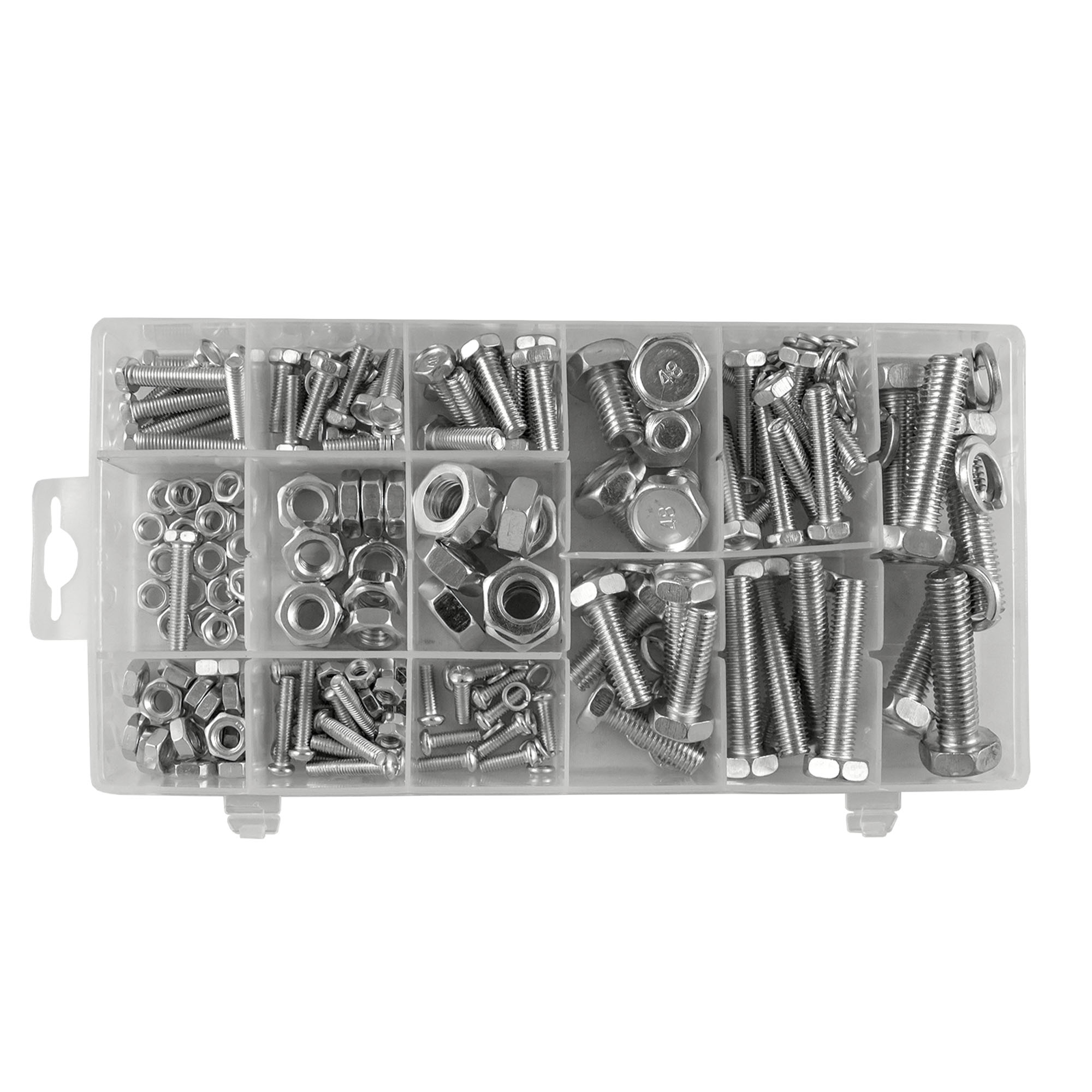 Estuche de 240 piezas de tornillos y tuercas. Contiene: Tornillos: M4x12 (10pcs) M4x20 (10pcs) M5x16 (10pcs) M5x25 (10pcs) M6x20 (10pcs) M6x30 (10pcs) M8x25 (5pcs) M8x40 (5pcs) M10x16 (5pcs) M10x40 (5pcs) Tuercas: M4 (20pcs) M5 (20pcs) M6 (20pcs) M8 (10pcs) M10 (10pc) Arandelas: M4 (20pcs) M5 (20pcs) M6 (20pcs) M8 (10pcs) M10 (10pc) Disponible en caja expositor de 6 unidades.