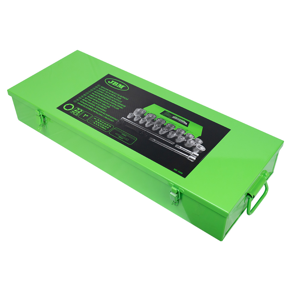 El estuche contiene: Vasos hexagonales de 1″ · Vasos hexagonales de 1″ de 36, 38, 41, 46, 50, 54, 55, 58, 60, 63, 65, 67, 70, 71, 75, 77, 80 mm Carracas · Carraca universal 650 mm barra adaptador extensión 1″ Barras de extensión · Barra de extensión 1″ 205, 410 mm largo Accesorios · Corredera para adaptador 1″