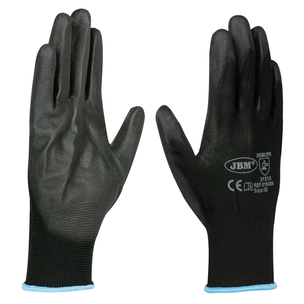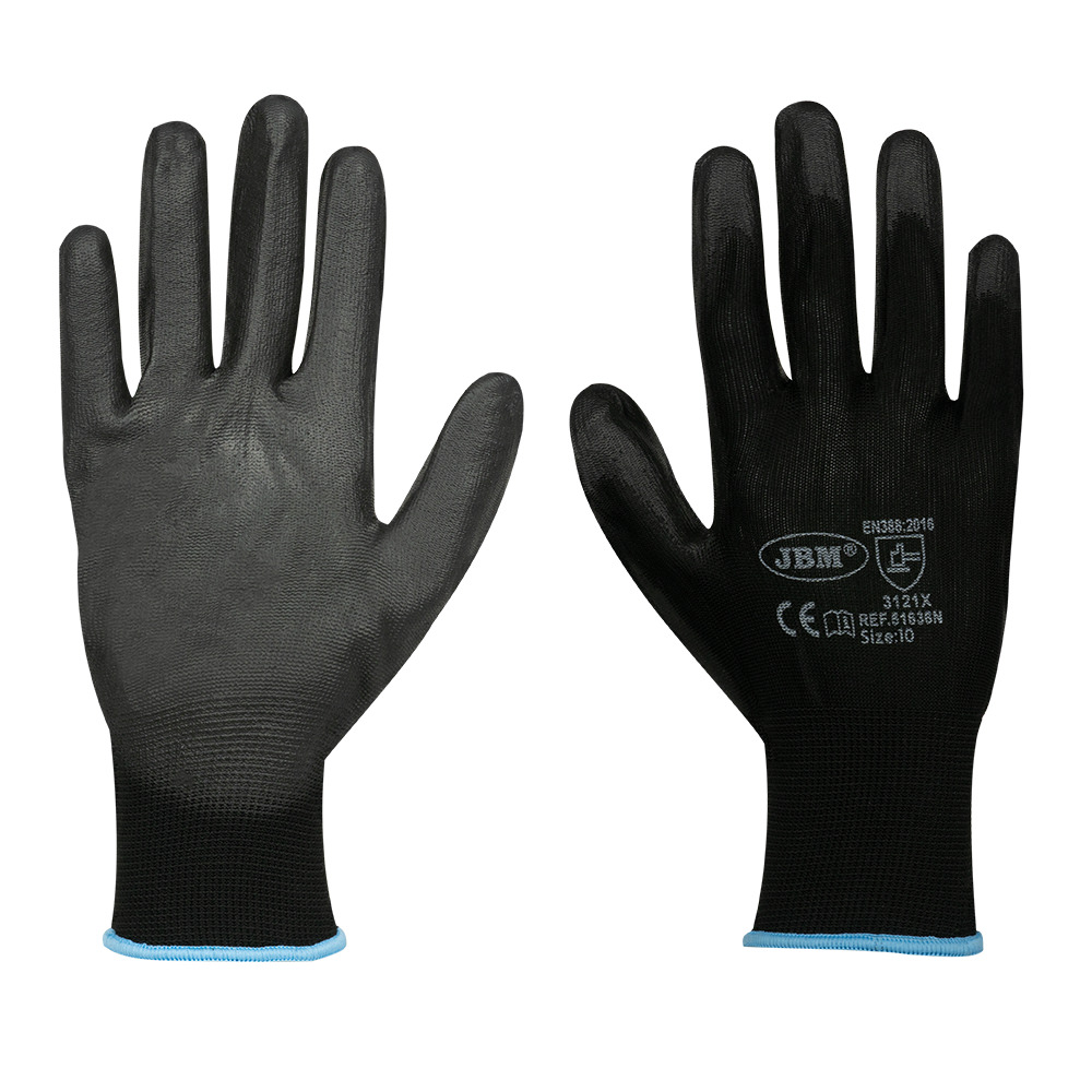 Guantes de Trabajo con Palma Reforzada de Poliuretano – Talla 10 – Color Negros · Guantes de alta calidad diseñados para proporcionar protección, confort y rendimiento superior en entornos laborales exigentes. · Palma reforzada con poliuretano (PU): Garantiza un agarre excelente y alta resistencia al desgaste, ideal para trabajos con superficies secas o ligeramente húmedas. · Diseño ergonómico y revestimiento liso: Ofrecen un ajuste perfecto, brindando flexibilidad y comodidad durante su uso prolongado. · Talla 10: Proporciona un ajuste seguro para la mayoría de las manos, asegurando eficacia y comodidad. · Protección eficaz: Ofrecen una excelente protección contra riesgos mecánicos en actividades como montaje, manipulación, mantenimiento, y trabajos industriales en general. Cumple con los estándares de calidad internacionales: · EN ISO 21420:2020. · EN 388:2016+A1:2018.