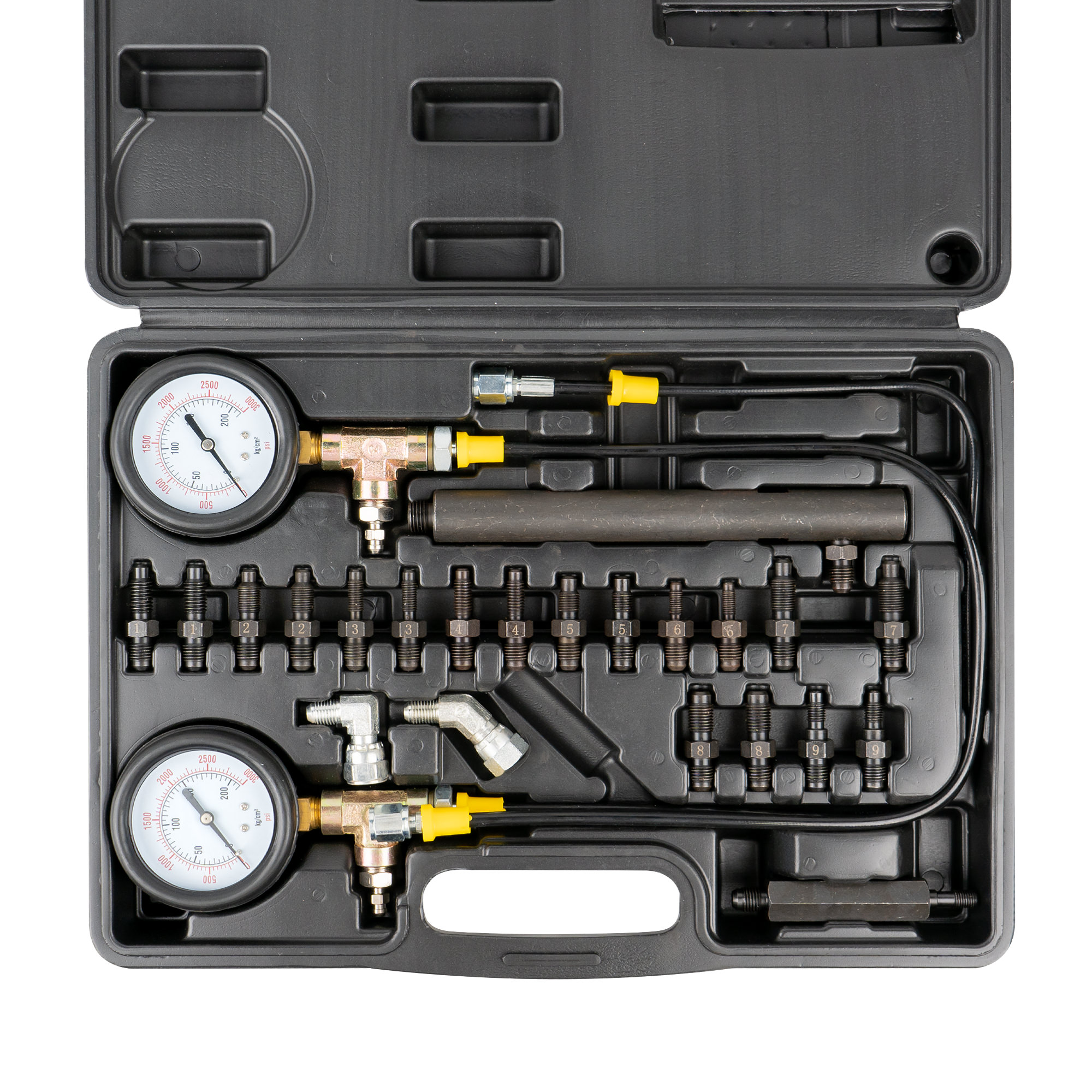 Este juego permite la comprobación de la presión hidráulica en las ruedas, pudiendo ser usado en vehículos con o sin ABS. Permite medir la diferencia la presión de los dos circuits de freno. Los manómetros están en MPa. Contiene: 1- Adaptador Teves 1- Adaptador giratorio 45 1- Adaptador giratorio de 90 2- Adaptador recto 7/16-24 2- Adaptador recto 1/4-28 2- Adaptador recto 3/8-24 2- Adaptador recto 5/16-24 2- Adaptador recto M10-1,5 2- Adaptador recto M8-1,25 2- M10-1.0 Adaptador de purga 2- Adaptador recto 7/16-20 2- M7-1.0 Adaptador recto0~25 Mpa. 0~250 kg/c㎡