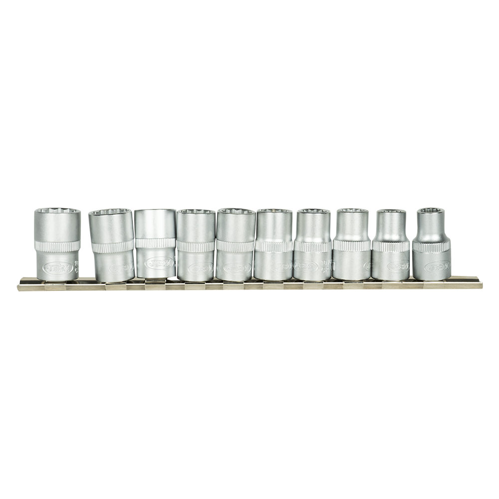 Blister metálico con guía de vasos hexagonales de 12 cantos de diferentes medidas: · x10 Uds de 1/2″: 10, 11, 12, 13, 14, 15, 16, 17, 18, 19mm