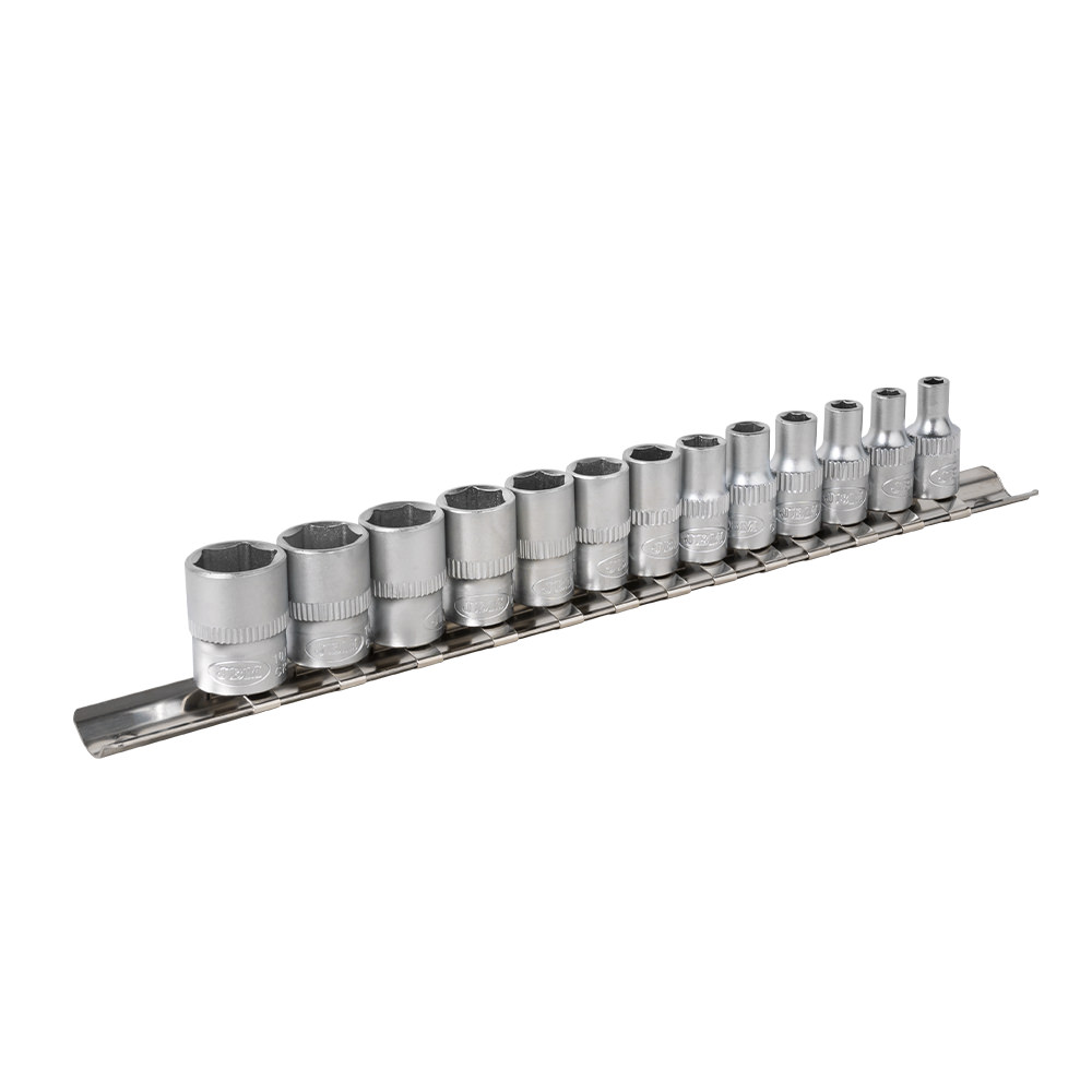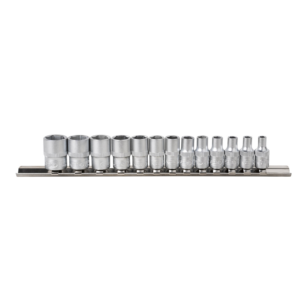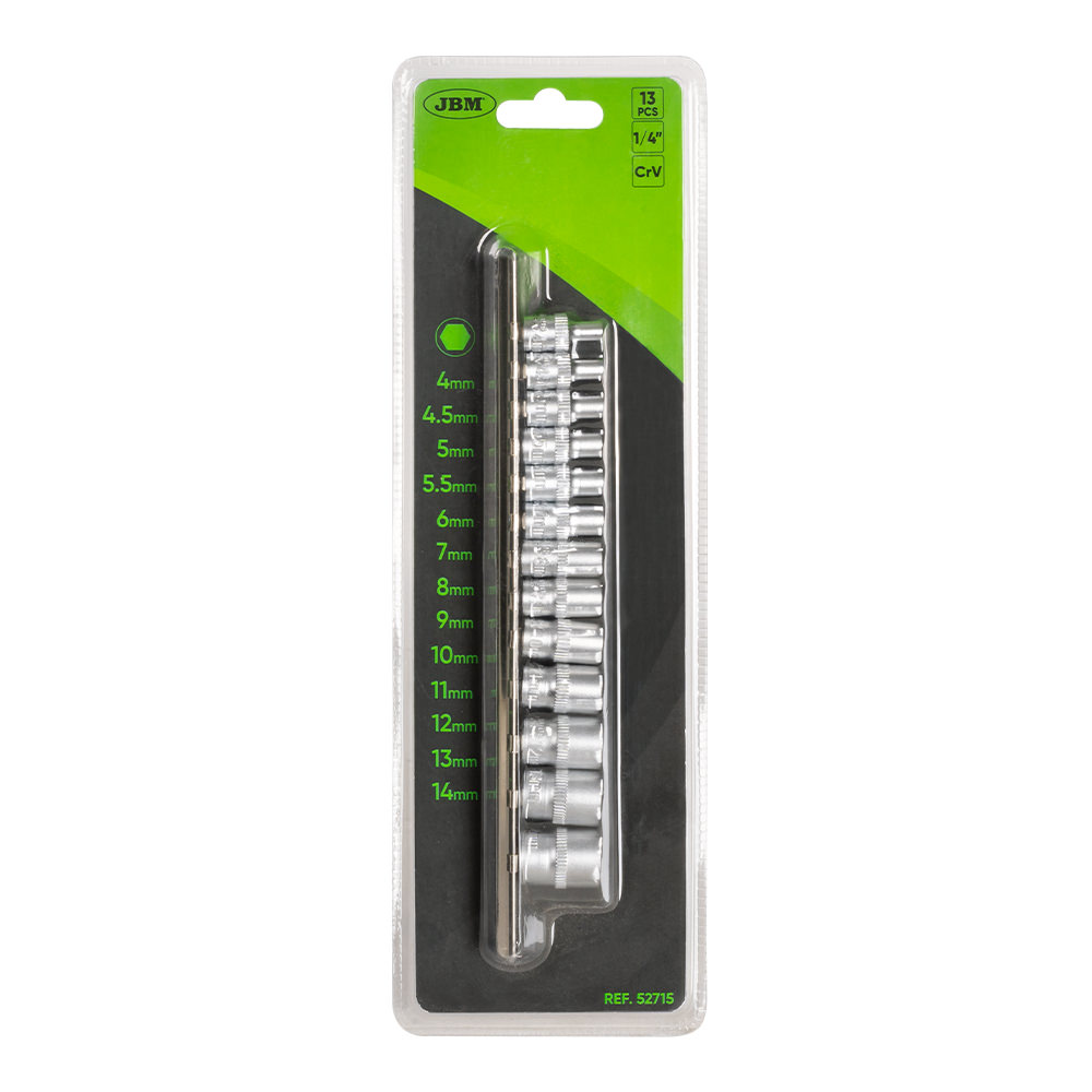 Blister metálico con guía de vasos hexagonales de diferentes medidas: · x13 Uds de 1/4″: 4, 4.5, 5, 5.5, 6, 7, 8, 9, 10, 11, 12, 13, 14mm