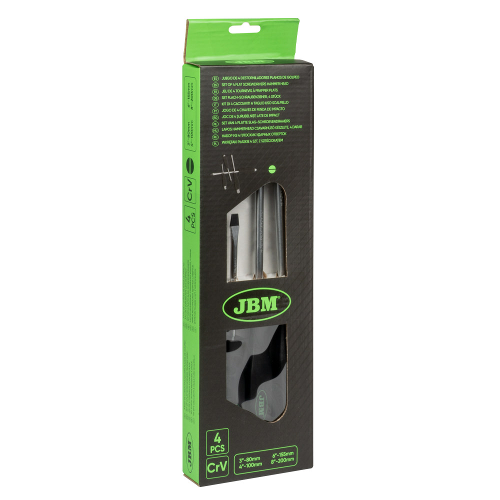 Este set incluye: · X4 Destornilladores planos de golpeo con diferentes medidas: 3″ – 80m, 4″ – 100mm, 6″- 155mm, 8″- 200mm.