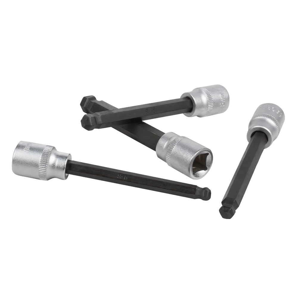 Blister metálico con guía de diferentes puntas allen de bola: · 3/8″ de 100mm HB3: 4, 5, 6, 7, 8 y 10mm.