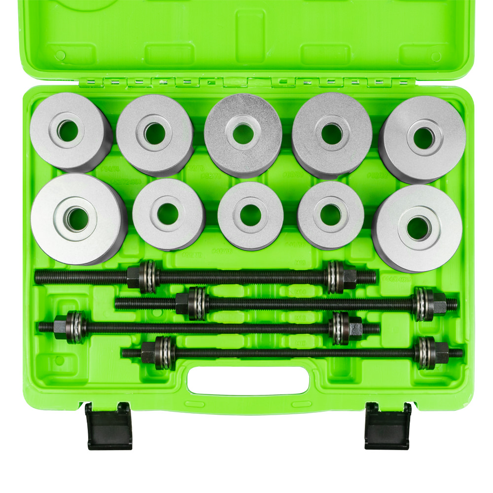 Para instalar y desinstalar casquillos y cojinetes o rodamientos de suspensión. Contiene cilindros de diferentes tamaños y barras roscadas de diferentes métricos. Medidas: M10, M12, M14, M16, M18 Adaptadores (Diámetro externo/interno): 90/80 85/75 82/72 80/70 78/68 76/66 74/64 72/62 70/60 68/58 66/56 64/54 62/52 60/50 58/48 56/46 54/44 52/42 50/40 48/38 46/36 44/34