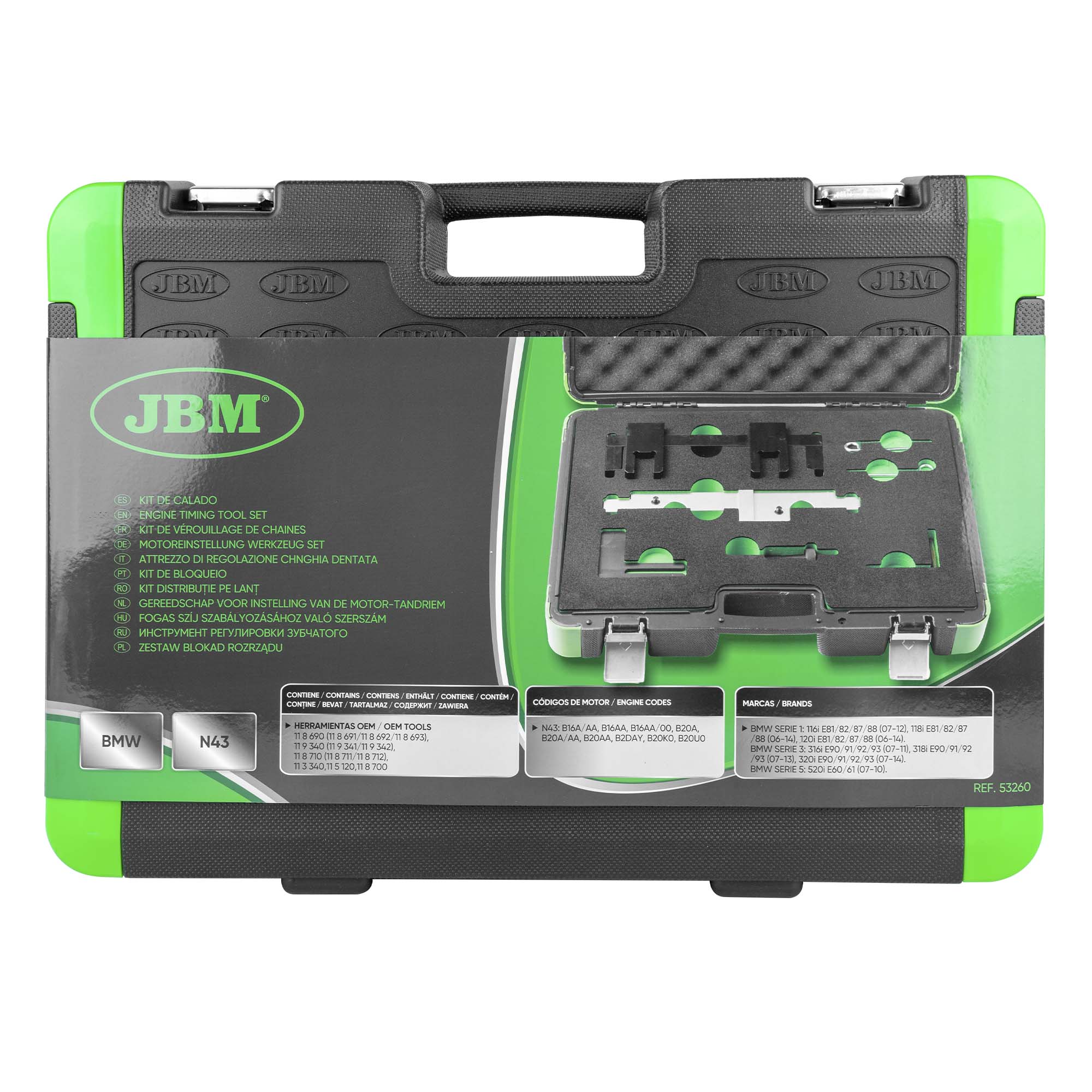 Herramientas OEM 11 8 690 (11 8 691/11 8 692/11 8 693), 11 9 340 (11 9 341/11 9 342), 11 8 710 (11 8 711/11 8 712), 11 3 340, 11 5 120, 11 8 700. Aplicaciones BMW 1 Series 116i E81/82/87/88 (07-12), 118i E81/82/87/88 (06-14), 120i E81/82/87/88 (06-14). BMW 3 Series 316i E90/91/92/93 (07-11), 318i E90/91/92/93 (07-13), 320i E90/91/92/93 (07-14). BMW 5 Series 520i E60/61 (07-10). Códigos de motor N43 B16A/AA, B16AA, B16AA/O0, B20A, B20A/AA, B20AA, B20AY, B20K0, B20U0.