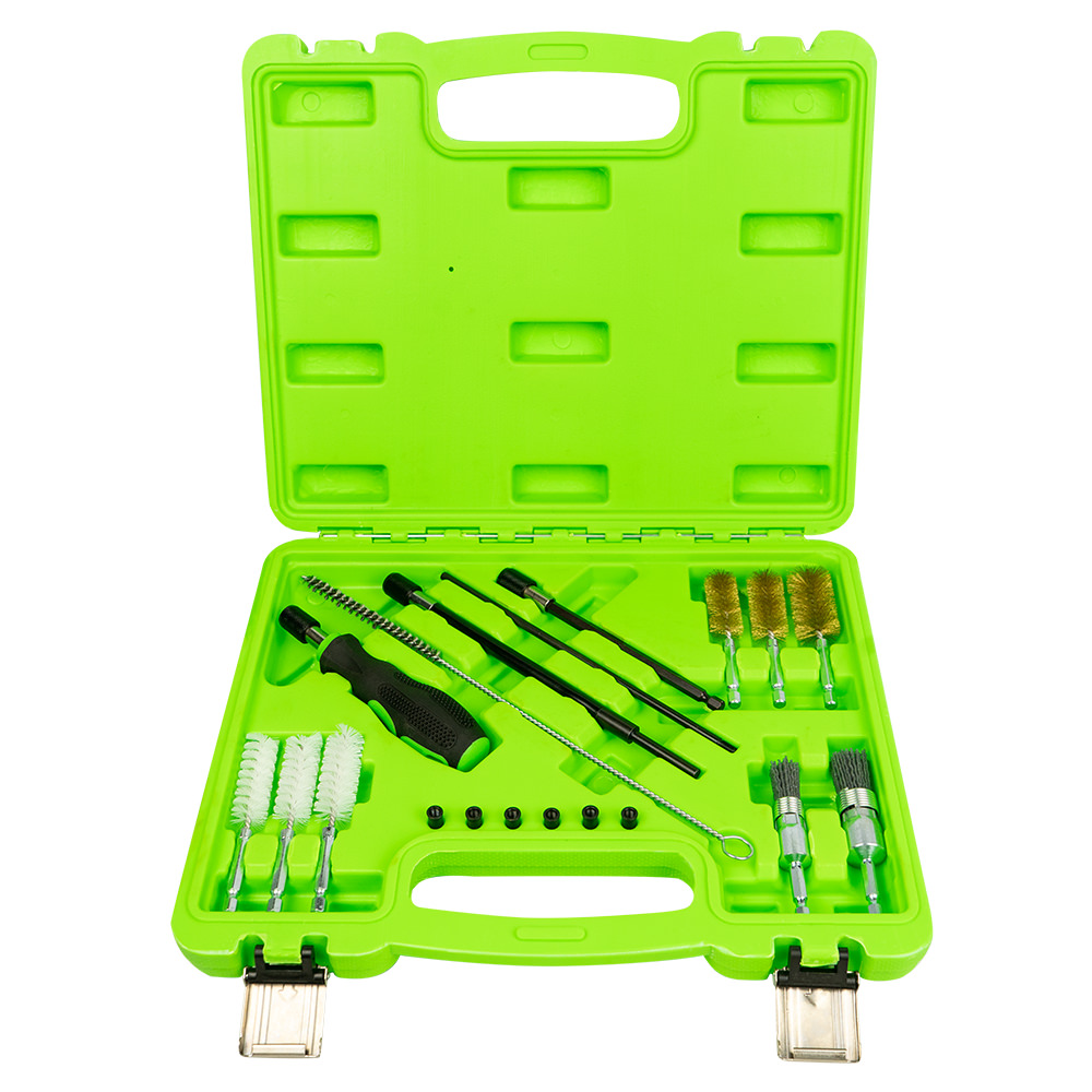 Kit con tres cepillos de acero revestido de latón para limpiar los restos de carbonilla restantes de las paredes laterales del asiento de inyectores así como dos cepillos de nailon de silicona para limpiar la base del asiento. Los cepillos de limpieza pueden conectarse rápidamente a la extensión flexible proporcionada. Este kit también contiene seis tapones de sellado y una varilla de inserción para evitar que los restos de carbonilla penetren accidentalmente dentro de la cámara de combustión durante el proceso, además de un cepillo de alambre de acero de pequeño calibre para limpiar la parte inferior del asiento. Contiene: · x3 cepillos de alambre de acero · x2 cepillos de silicona-nylon · x1 extensor · x6 tapones de cierre para el sellado de la cámara de combustión · x1 varilla para la inserción de los tapones de cierre · x1 cepillo de alambre de acero para la limpieza de la culata