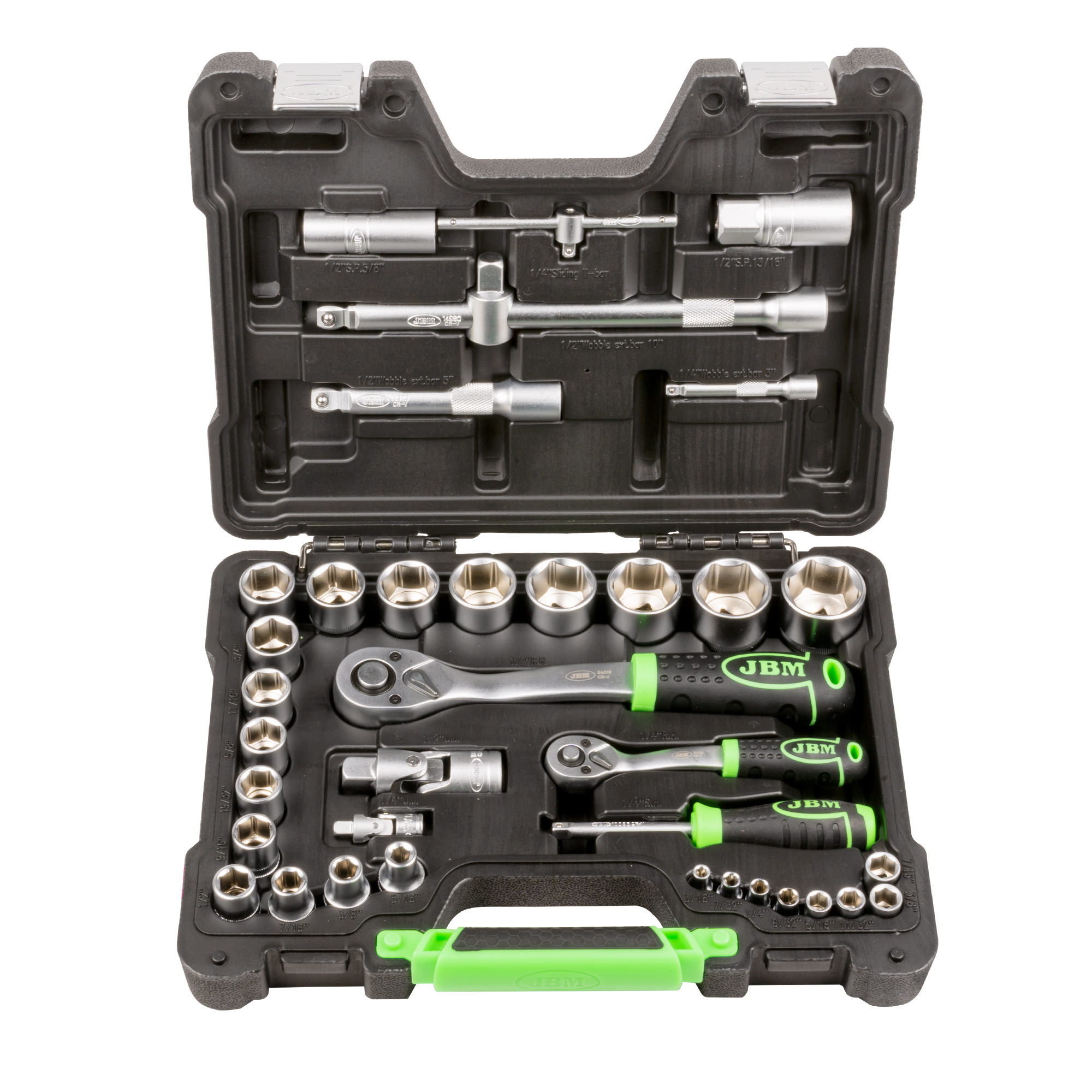 MALETÍN DE HERRAMIENTAS DE 37 PIEZAS CON VASOS HEXAGONALES EN PULGADA 1/2″ Y 1/4″ CINCADO