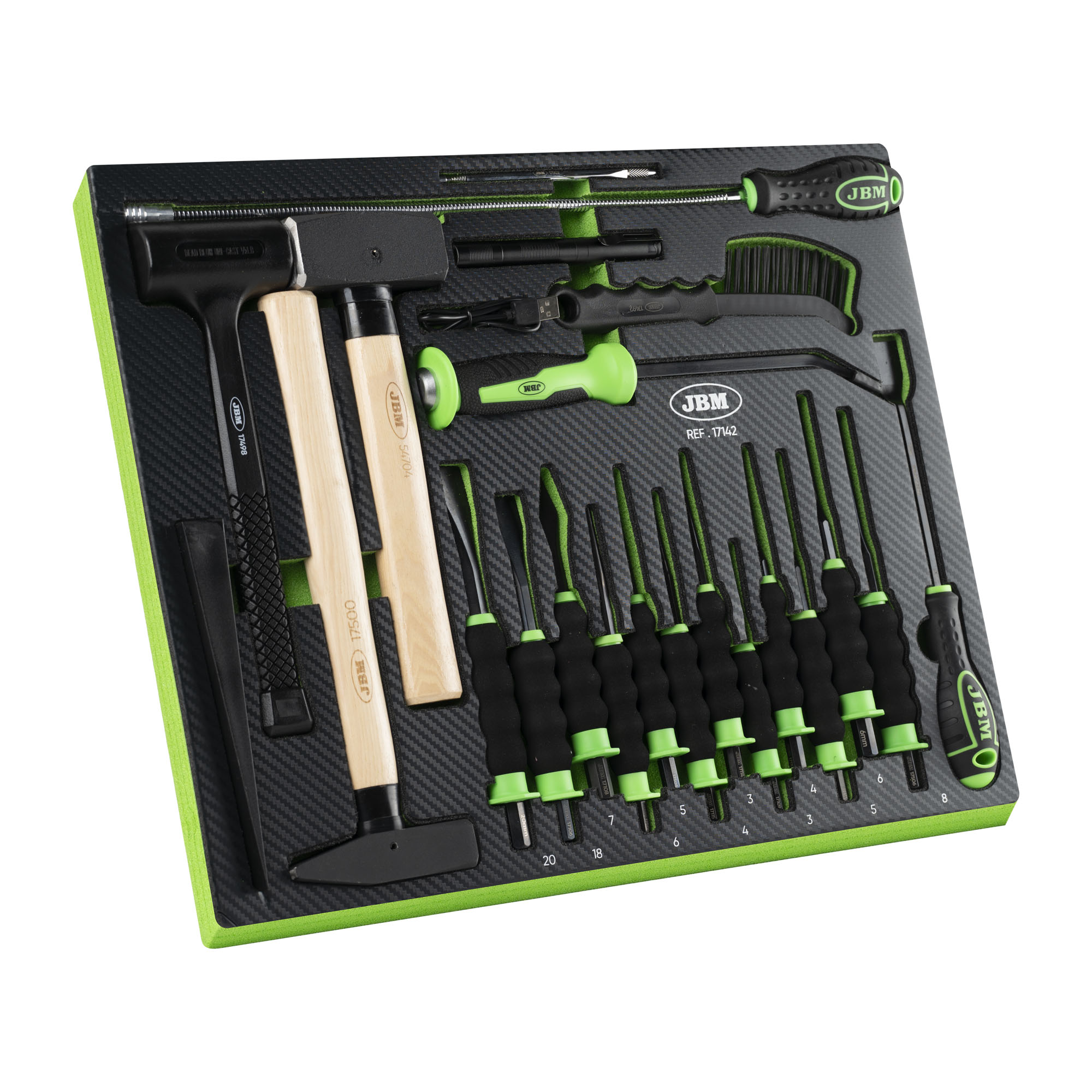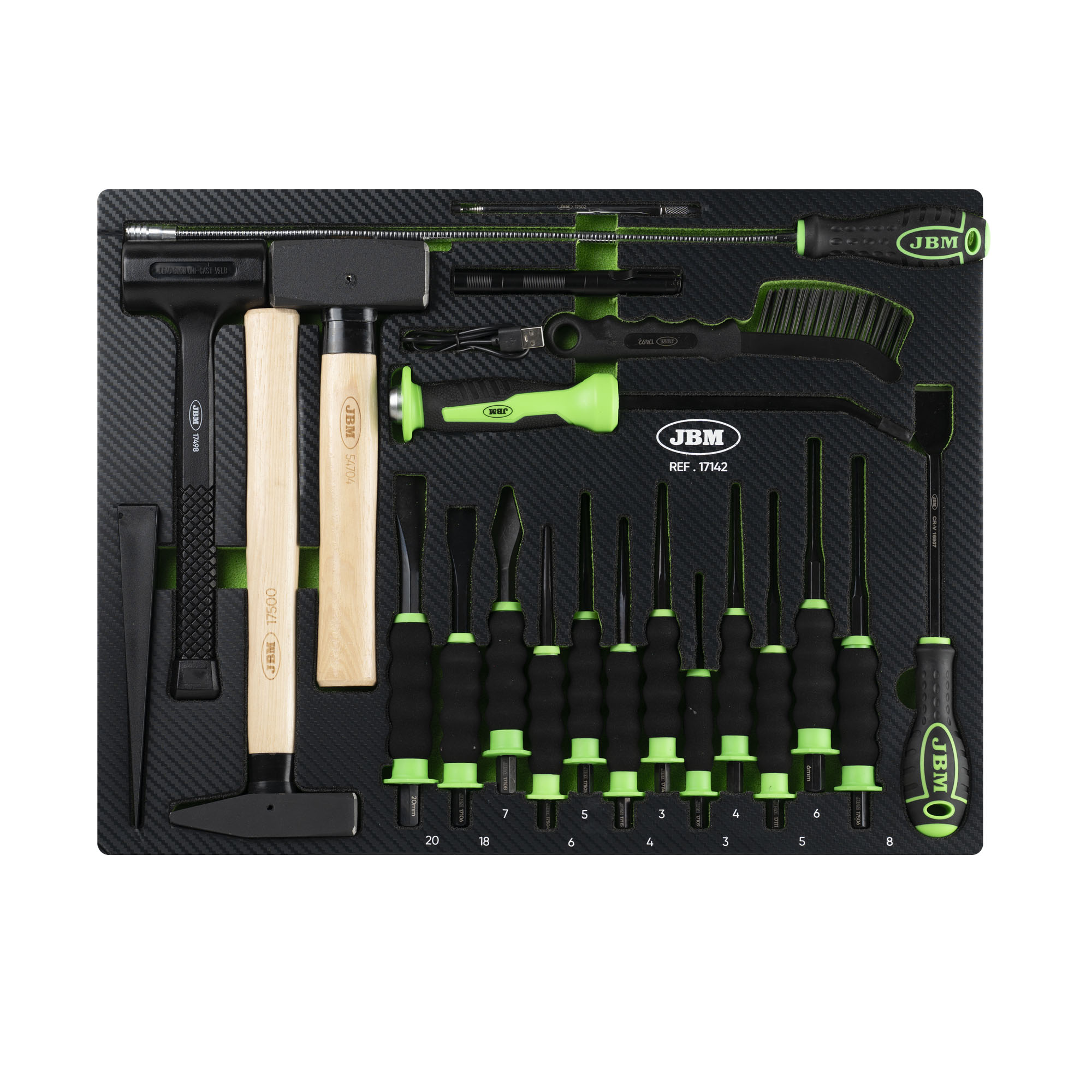 INCLUYE: CUÑA DE PLÁSTICO, 195 X 30 MM MARTILLO NYLON ANTI-REBOTE 400G MARTILLO UNIVERSAL CON MANGO DE FIBRA, 400 G RECOGEDOR MAGNÉTICO FLEXIBLE, 510 MM, Ø CABEZA = 15 MM SOPORTE TELESCÓPICO 2 EN 1 PARA SOLENOIDE CON HERRAMIENTA DE LIMPIEZA A CHORRO Y AJUSTE, 150 – 675 M CINCEL PLANO, OCTOGONAL, 20 MM PUNZON CENTRAL, OCTOGONAL, 10 MM PUNZÓN CÓNICO, Ø5 MM, 185 MM DE LARGO BOTADOR CILÍNDRICO, Ø8 MM