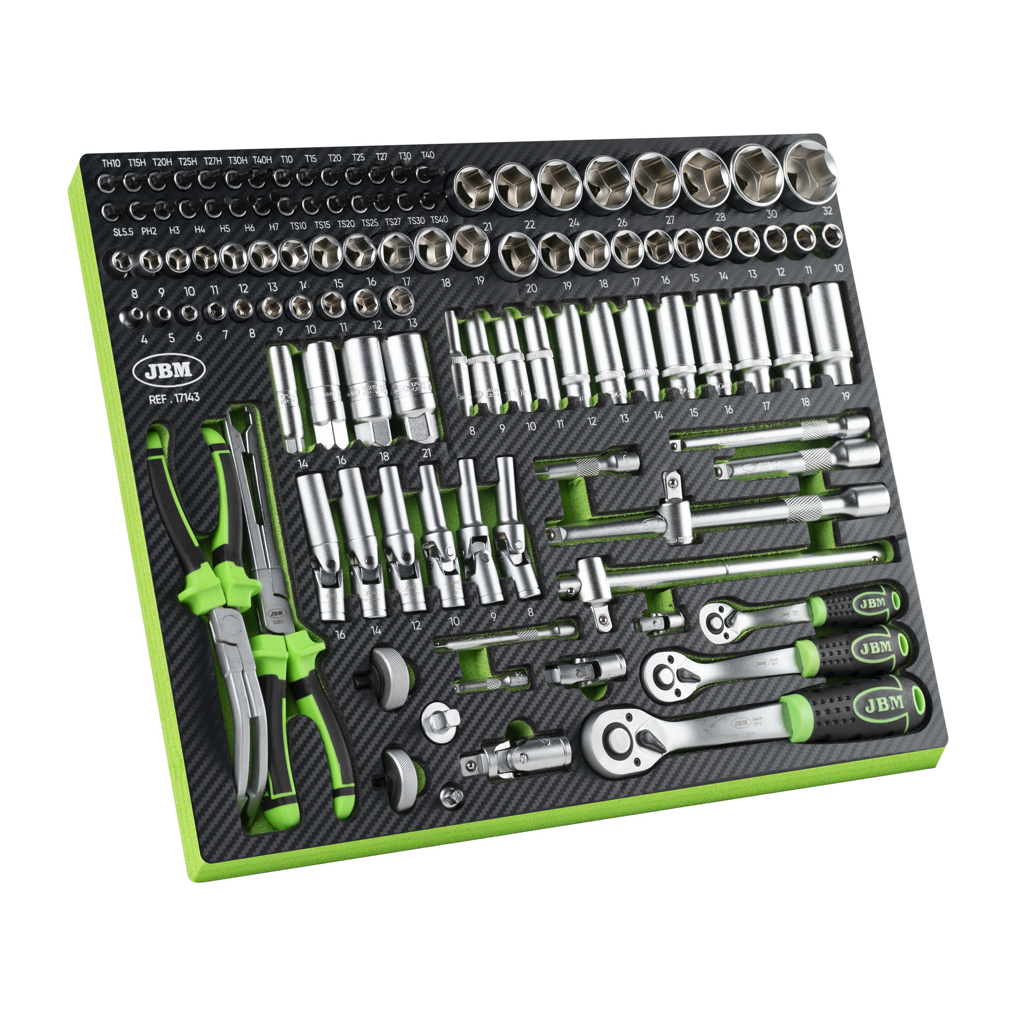 CONTIENE: – x1 ADAPTADOR 3/8″ HEMBRA – 1/4″ MACHO. – x1 ADAPTADOR CON CORREDERA DE 250MM 1/2″. – x1 ADAPTADOR DESLIZANTE DE 3/8″ HEMBRA X 1/2″ MACHO. – x1 ADAPTOR FOR EXTENSION 1/2”(F) X 3/8”(M). – x1 ARTICULACION UNIVERSAL 1/4″. – x1 ARTICULACIÓN UNIVERSAL DE 1/2″. – x1 ARTICULACIÓN UNIVERSAL DE 3/8″. – x1 BARRA DE EXTENSIÓN DE 1/4″ 100MM. – x1 BARRA DE EXTENSION DE 1/4″ 50MM. – x1 BARRA DE EXTENSIÓN DE 3/8″ 150MM LARGO . – x1 BARRA DE EXTENSIÓN DE 3/8″ 75MM LARGO. – x1 BARRA EXTENSIÓN 1/2″ 125MM. – x1 BARRA EXTENSIÓN 1/2″ 250MM. – x1 CARRACA DE 72 DIENTES 1/4″ 145MM CINCADA. – x1 CARRACA DE 72 DIENTES 1/2″ 255MM CINCADA. – x1 CARRACA DE 72 DIENTES 3/8″ 200MM CINCADA. – x1 DISC RATCHET 1/4”, 72 TEETH. – x1 DISC RATCHET 3/8”, 72 TEETH. – x1 EXTRACTOR DE CONEXIONES DE CALENTADOR EN ÁNGULO – 235MM. – x1 EXTRACTOR DE CONEXIONES DE CALENTADOR RECTO – 250MM. – x5 FLANK DEEP SOCKET 3/8”, 6 PT. 16, 17, 18, 19, 8, 9MM. – x1 FLANK SOCKET 1/2”, 6 PT. 26MM. – x1 FLANK SOCKET 1/2”, 6 PT. 28MM. – x6 VASO ARTICULADO PARA BUJÍA DE PRECALENTAMIENTO 3/8″ 75 MM 8, 9, 10, 12, 14, 16MM. – x12 VASO CORTO HEX 3/8″ DE 8, 9, 10, 11, 12, 13, 14, 15, 16, 17, 18, 19 MM. – x17 VASO DE 1/2″ HEX. DE 10, 11, 12, 13, 14, 15, 16, 17, 18, 19, 20, 21, 22, 24, 27, 30, 32MM. – x6 VASO DE 65MM LARGO, 3/8″ DE 10, 11, 12, 13, 14, 15MM. – x1 VASO DE BUJIA HEX. DE 16MM 3/8″. – x1 VASO DE BUJIA HEX. DE 18MM 3/8″. – x1 VASO DE BUJIA HEX. DE 21MM 3/8″. – x1 VASO DESTORNILLADOR DE ESTRELLA (PH)#2. – x4 VASO DESTORNILLADOR HEX. DE 3, 4, 5, 6MM. – x1 VASO DESTORNILLADOR PLANO (SL) DE 5.5MM. – x1 VASO DESTORNILLADOR TORX (TX) T10. – x1 VASO DESTORNILLADOR TORX (TX) T10 INV. – x1 VASO DESTORNILLADOR TORX (TX) T15. – x1 VASO DESTORNILLADOR TORX (TX) T15 INV. – x1 VASO DESTORNILLADOR TORX (TX) T20. – x1 VASO DESTORNILLADOR TORX (TX) T20 INV. – x1 VASO DESTORNILLADOR TORX (TX) T25. – x1 VASO DESTORNILLADOR TORX (TX) T25 INV. – x1 VASO DESTORNILLADOR TORX (TX) T27. – x1 VASO DESTORNILLADOR TORX (TX) T27 INV. – x1 VASO DESTORNILLADOR TORX (TX) T30. – x1 VASO DESTORNILLADOR TORX (TX) T30 INV. – x1 VASO DESTORNILLADOR TORX (TX) T40. – x1 VASO DESTORNILLADOR TORX (TX) T40 INV. – x1 VASO DESTORNILLADOR TORX 5 PUNTAS TS10. – x1 VASO DESTORNILLADOR TORX 5 PUNTAS TS15. – x1 VASO DESTORNILLADOR TORX 5 PUNTAS TS20.. – x1 VASO DESTORNILLADOR TORX 5 PUNTAS TS25. – x1 VASO DESTORNILLADOR TORX 5 PUNTAS TS27. – x1 VASO DESTORNILLADOR TORX 5 PUNTAS TS30. – x1 VASO DESTORNILLADOR TORX 5 PUNTAS TS40. – x1 VASO ESPECIAL PARA BUJÍA, DE PARED DELGADA 3/8″ 14 MM. – x11 VASO HEX. 1/4″ DE 4, 5, 6, 7, 8, 9, 10, 11, 12, 13, 14MM. – x1 VASO PUNTA 1/4″ HEXAGONAL 7.