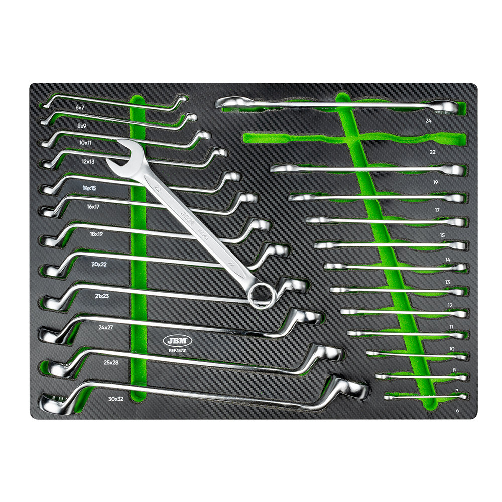 Ideal para completar tu juego de herramientas, llenar de accesorios tu carro o tú caja de herramientas portátil. Con un acabado de tapa dura simulado en fibra de carbono, que ofrece durabilidad y un diseño elegante para organizar todas las herramientas de manera eficiente. INCLUYE: · Llaves acodadas 2 bocas estrella: 6×7, 8×9, 10×11, 12×13, 14×15, 16×17, 18×19, 20×22, 21×23, 24×27, 25×28, 30x32mm. · Llaves combinadas: 6, 7, 8, 10, 11, 12, 13, 14, 15, 17, 19, 22, 24mm.