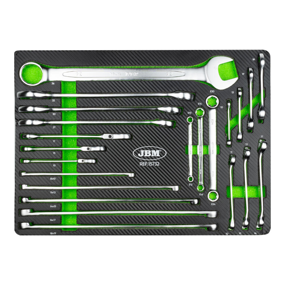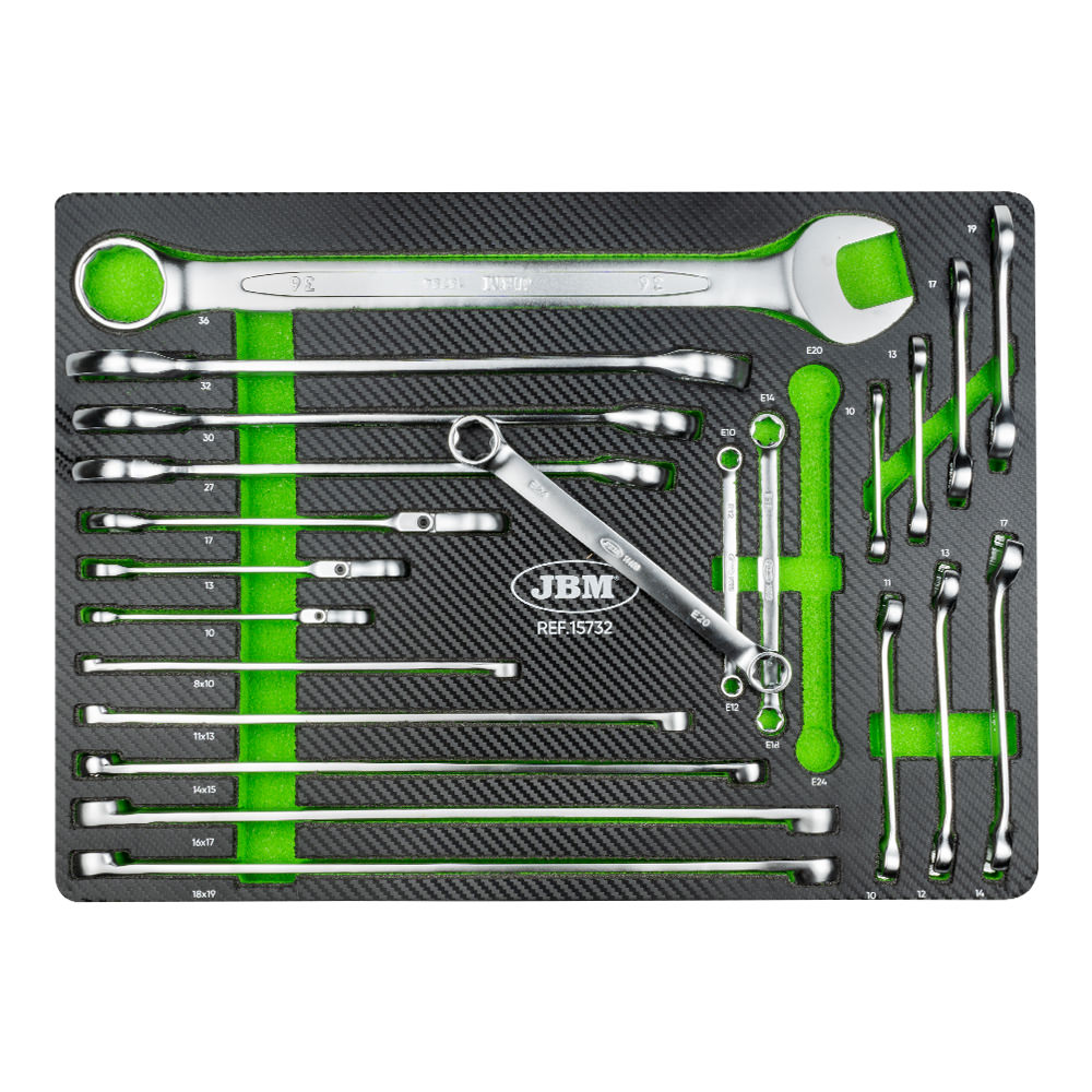 Ideal para completar tu juego de herramientas, llenar de accesorios tu carro o tú caja de herramientas portátil. Con un acabado de tapa dura simulado en fibra de carbono que ofrece durabilidad y un diseño elegante para organizar todas las herramientas de manera eficiente. INCLUYE: · Llaves combinadas articuladas con trinquete: 10, 13,17 mm. · Llaves hexagonales boca abierta: 10×11, 12×13, 14x17mm. · Llaves estrella plana torx: E10xE12, E14xE18, E20xE24. · Llaves extralargas 12 cantos: 8×10, 11×13, 14×15, 16×17, 18x19mm. · Llaves combinadas: 27, 30, 32, 36mm. · Llaves combinadas cortas: 10, 13, 17, 19mm.