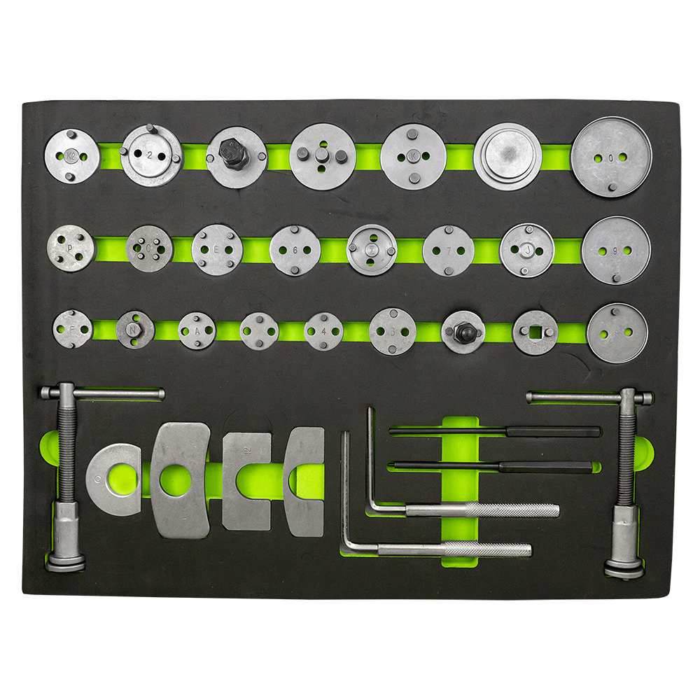 MÓDULO REPOSICIONADOR DE FRENOS 34PCS 24x adaptadores 4x placas de retención 2x ejes para roscar 2x punzones 2x llaves hexagonales