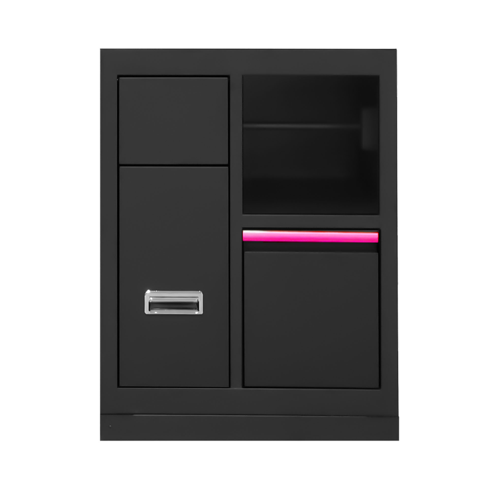 NUESTROS MUEBLES SE ENTREGAN DE SERIE CON TIRADORES VERDES. EN LOS MODELOS DISPONIBLES EN DISTINTOS COLORES, LOS TIRADORES SE SUMINISTRAN EN LOS TONOS CORRESPONDIENTES A CADA COMPONENTE SELECCIONADO. Mueble compacto con basura, estantería y cajón integrado para almacenamiento de útiles y residuos. Perfecto para optimizar y mantener ordenada la zona de trabajo en taller, garaje o uso particular.