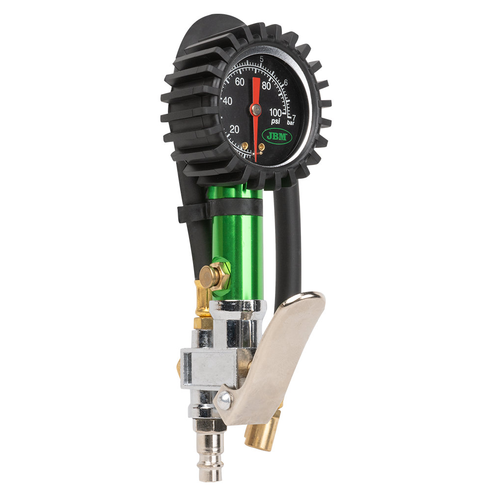 Diseñada para mantener la presión adecuada en tus neumáticos, esta pistola es compatible con coches, motos, bicicletas e incluso camiones domésticos comunes. Ideal para quienes buscan seguridad y eficiencia, ofrece una lectura clara y precisa gracias a su manómetro analógico protegido con goma, y cuenta con funciones adicionales como el botón de purga de aire para realizar ajustes exactos de presión. Nota: No es compatible con camiones de trabajo pesado debido al tamaño diferente del núcleo de la válvula. Especificaciones: · Rango de Medición del Manómetro: 0–100 PSI / 0–7 BAR · Manómetro Analógico con Protector de Goma: Protege contra impactos y caídas · Botón de Purga de Aire: Permite desinflar con precisión para ajustes rápidos · Longitud de Manguera: 200 mm · Manguera Resistente a Torceduras: Asegura un flujo de aire constante · Boquilla de Latón con Clip: Conexión segura y duradera · Conexión Estándar Industrial (EU): Compatible con la mayoría de los compresores · Compatibilidad: Coches, motos, bicicletas, camiones ligeros domésticos