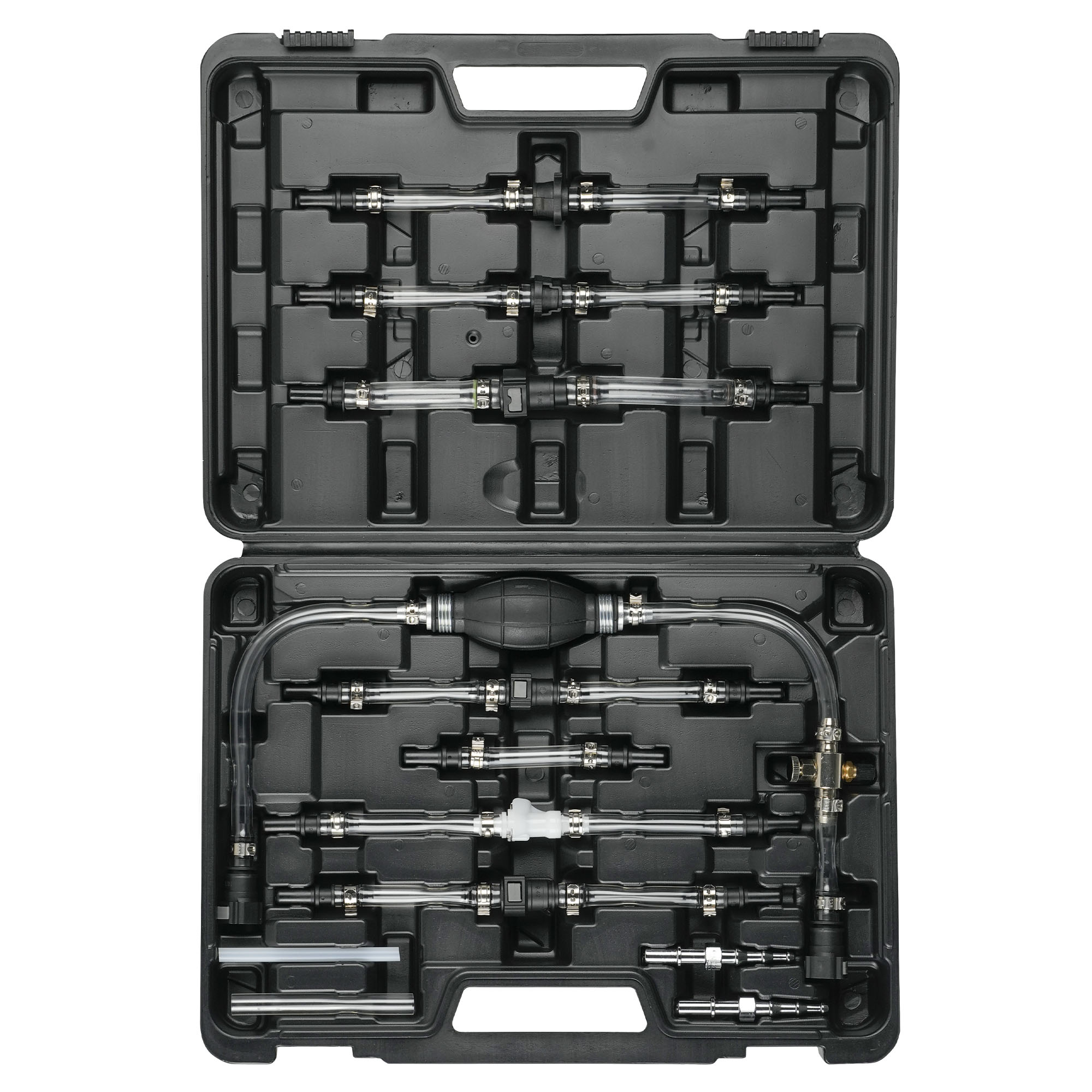 Este juego completo de purga de combustible está diseñado para trabajar con el circuito de baja presión de combustible, reintroduciendo el combustible en la línea después del mantenimiento. Los tubos transparentes permiten la detección visual de aire en el sistema de combustible o en la línea de aspiración accidental. Equipado con los últimos conectores rápidos macho y hembra compatibles para modelos: Fiat, Ford, Land Rover, Mercedes-Benz, PSA, Renault, Rover y Vauxhall/Opel.