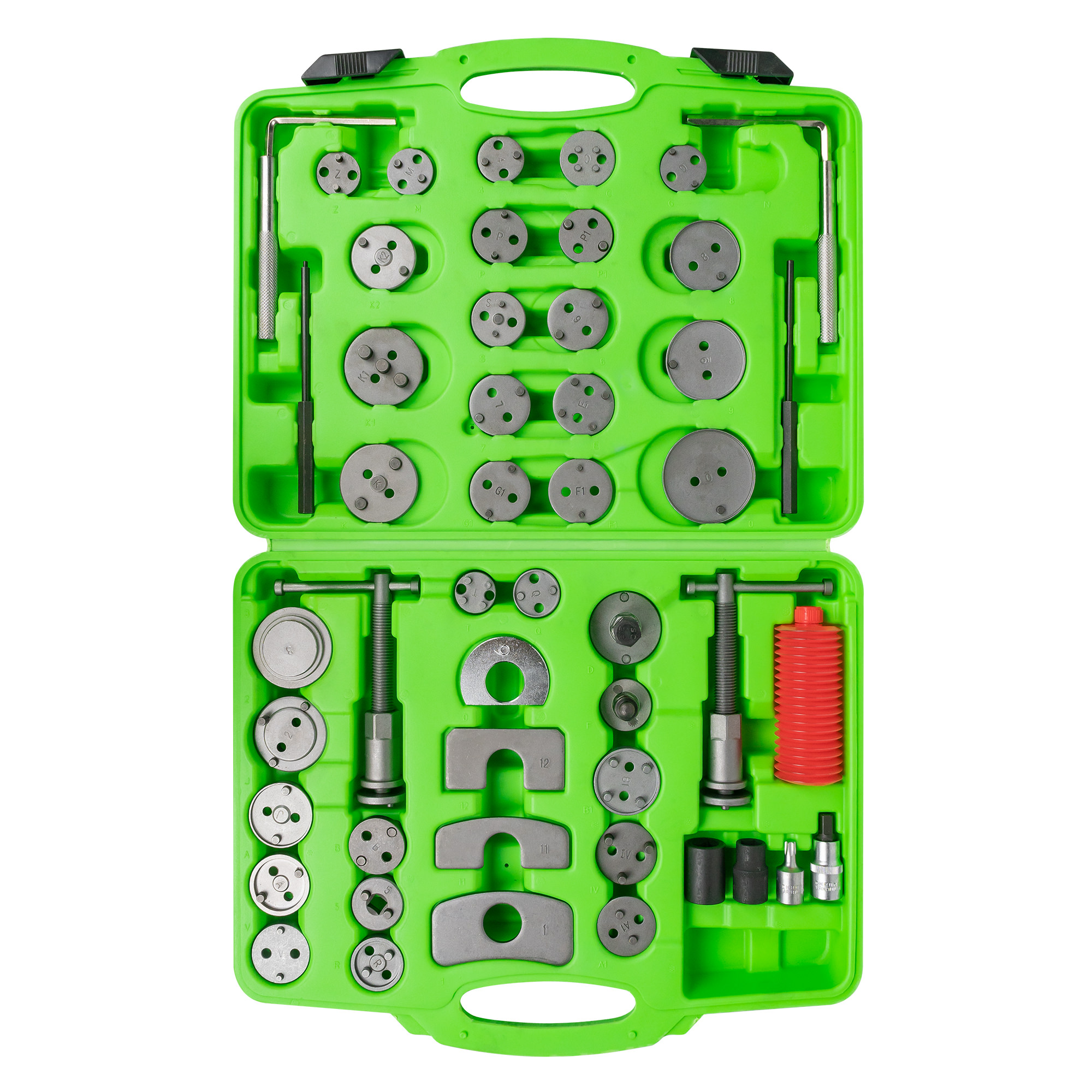 Sistema de uso múltiple con 50 piezas diseñado para la extracción y reposicionamiento de pistones de freno en una amplia variedad de vehículos. Compatible con marcas: Volvo, BMW, Mini Austin, Saab, GM Motors, VW, Subaru, Mercedes- Benz, Mitsubishi, ToyotaOpel, Citroën, Peugeot, Renault, Alfa Romeo, Audi, Citroën, Fiat, Ford, Honda, Jaguar, Lancia, Nissan, Peugeot, Renault, Seat, Subaru. Ideal para talleres mecánicos y profesionales del mantenimiento automotriz. Contenido del Set: · 1x Lista de modelos de vehículos y usos. · 35x Adaptadores para vehículos. · 1x Pinza de rotación derecha (rosca derecha). · 1x Pinza de rotación izquierda (rosca izquierda). · 3x Cojines de apoyo para espacios limitados. · 1x Fuelle con aceite lubricante. · 100g de grasa. Varios bits especiales para frenos: · ½” Dr + 10 mm pentagonal – 56 mm. · ½” Dr + 14 mm macho – 38 mm (Opel Astra G, Zafira, Smart). · ½” Dr + 19 mm macho – 8 mm (Bendix, Citroën, Peugeot, Renault).