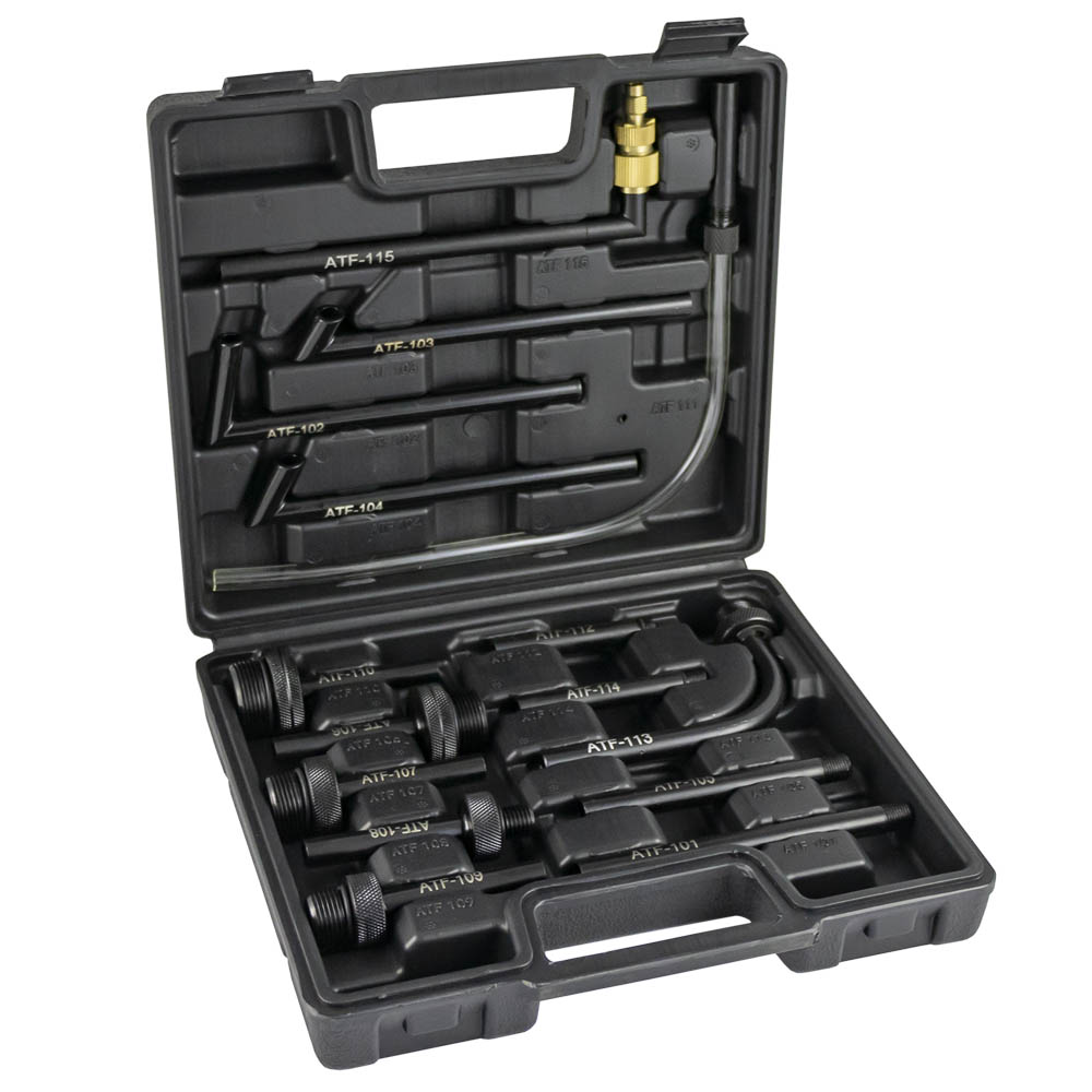Incluye: ATF101: FORD 1/8 – 27 (NPT). ATF102: Universal BMW, Honda, Nissan, etc. ATF103: VW/Audi. Skoda. ATF104: VW/Audi. Porsche. ATF105: VW/Audi, Mini cooper M10x1.0 ATF106: VW/Audi DSG M24 x 1.5 ATF107: VW7Audi CVT M22x1.5 ATF108: Mercedes M12 x 1.5 ATF109: V/W. Skoda M18x1.5 ATF110: Audi/VW, Skoda M30x1.5 ATF111: Universal flexible 300mm. Honda. Hyundai. KIA. etc. ATF112: Volvo 5/16 – 24 (UNF) ATF113: Toyota, Lexus M18 x 1.5 ATF114: Nissan, Infinity M8 x 1.0 ATF115: ATF-Adapter VW Passat