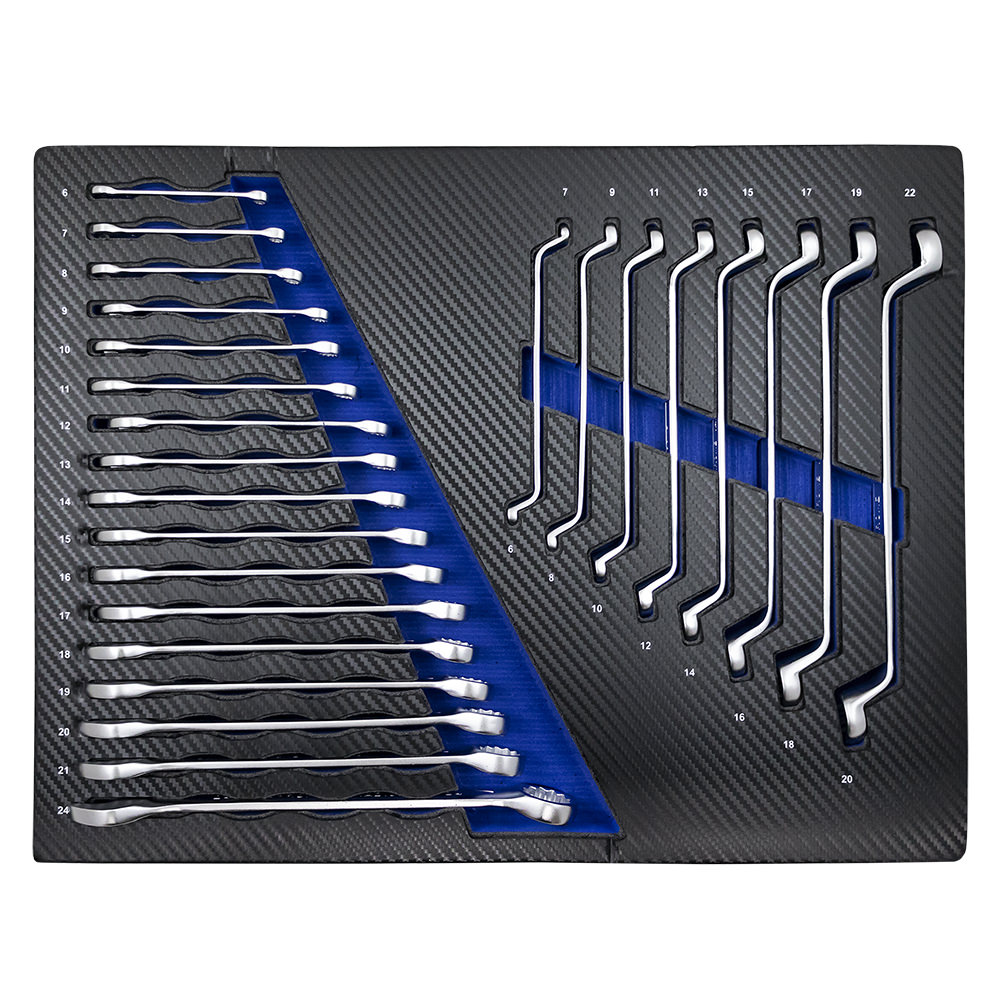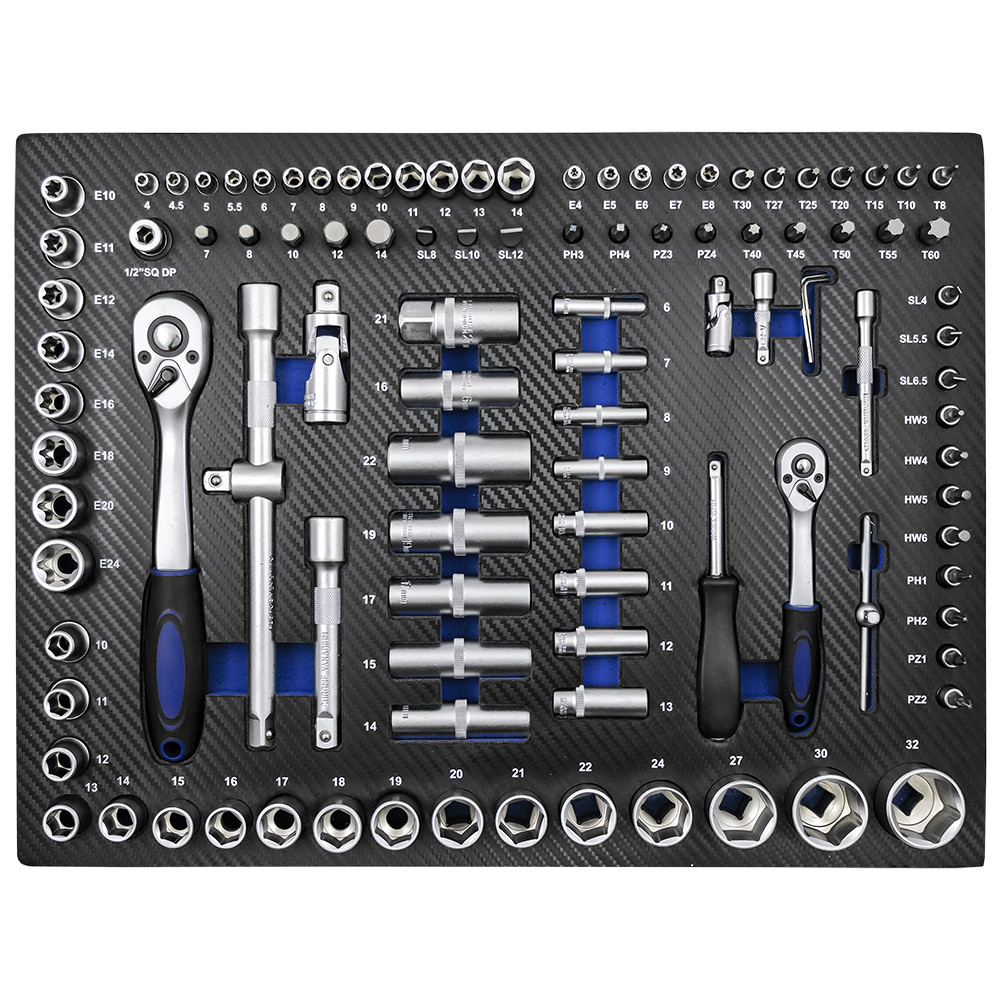 1 Carraca universal de 1/2″ con expulsador de vaso 1 Adaptador de cabezales 1/2″*5/16″ 5 vasos métricos largos de 1/2″, medidas : 14, 15, 17, 19 y 22 mm 17 Vasos métricos de 1/2″, medidas : 10, 11, 12, 13, 14, 15, 16, 17, 18, 19, 20, 21, 22, 24, 27, 30 y 32 mm 8 Vasos Torx de 1/2″, medidas : E10, E11, E12, E14, E16, E18, E20 y E24 2 Vasos de bujía de 1/2″, medidas : 16 y 21 mm 2 Barras de extensión de 5″ y 10″ 1 Articulación universal de 1/2″ 1 Adaptador 3/8″ hembra-1/2″ macho 1 Carraca universal de 1/4″ con expulsador de vaso 18 Cabezales para el destornillador de punta: PH : #1, #2 / PZ : #1 y #2 / HEX : 3, 4, 5, 6 mm / SL : 4, 5.5, 6.5 mm / TX : 8, 10, 15, 20, 25, 27 y 30 mm 1 Mango destornillador de 1/4″ 1 Articulación universal de 1/4″ 1 Mango corredizo de 1/4″ 2 Barras de extensión de 2″ y 3″ 13 Vasos métricos, medidas : 4, 4.5, 5, 5.5, 6, 7, 8, 9, 10, 11, 12, 13 y 14 mm 8 Vasos largos de 1/4″, medidas : 6, 7, 8, 9, 10, 11, 12, 13 mm 5 Vasos Torx de 1/4″, medidas : E4, E5, E6, E7 y E8 17 Cabezales (8 mm): HEX : 7, 8, 10, 12, 14 mm / SL : 8, 10, 12 mm / PH : #3, #4 / PZ : #3, #4 / TX : 40, 45, 50, 55, 60 mm 3 Llaves Allen : 1.5, 2, 2.5 mm 1 módulo acabado de fibra de carbono Módulo de llaves acodadas de 6x7mm a 18x19mm + 20x22mm. Módulo de llaves combinadas de 6 a 22mm. Destornilladores: 2x38mm, 6x38mm, PH0x75, PH1 x 100, PH2 x 100, PH3 x 150, PH4 x 200, SL3 x 100, 5 x 75mm, 6x100mm, 8x150mm, SL10 x 200. set de 9 llaves Allen en forma de “L” con cabota redonda. set de 9 llaves torx en forma de L. Martillo de bola Martillo de nylon Alicate ajustable 10 “ Alicates Seger para interiores de 8“ (boca recta) Alicates Seger para exteriores de 8“ (boca recta) Alicate mordaza 10“ Alicate de corte diagonal 7.5“ Alicate de punta larga de 8“ Cinta métrica 3m