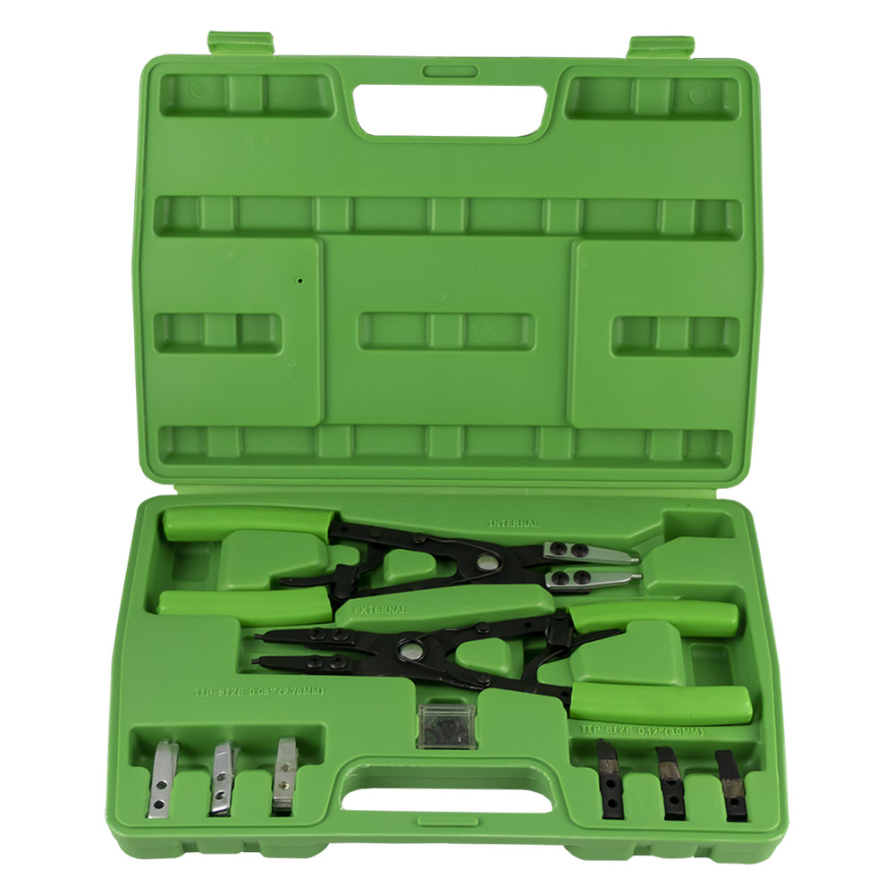 El set conteniene: – x1 Alicate para circlips externos – x1 Alicate para circlips internos – x16 puntas con diferentes ángulos (90º/45º/15º/0º), 8 tornillos.