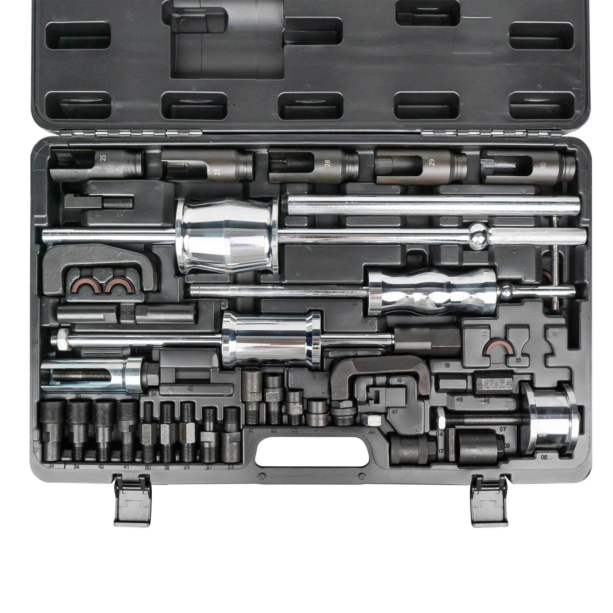 Adecuado para la mayoría de los inyectores diesel, incluye varios adaptadores. INCLUYE: – 3 martillos deslizantes diferentes: – 1,6kg, longitud 160mm. – 2,7kg, longitud 460mm. – 5,1kg, longitud 600mm. – 2 garras de tiro con apertura de horquilla: – 13,7x18mm, longitud 105mm. – 12,7x19mm, longitud 130mm. – 5 vasos ranurados 1/2″ y 6 caras, longitud 100 mm. Tamaños 25-27-28-29-30mm. – Extractor de Inyector, diseño del manguito, con casquillos, diámetro exterior 35mm. diámetro interior 29mm. – Husillo M17x1,0. – Adaptador de tiro con rosca exterior, M27x1.0 (3 piezas) y M25x1,0. – Adaptador de tiro con rosca interior, M27x1.0 (3 piezas). – Adaptador para el martillo deslizante para extractor interior, exterior y garra.