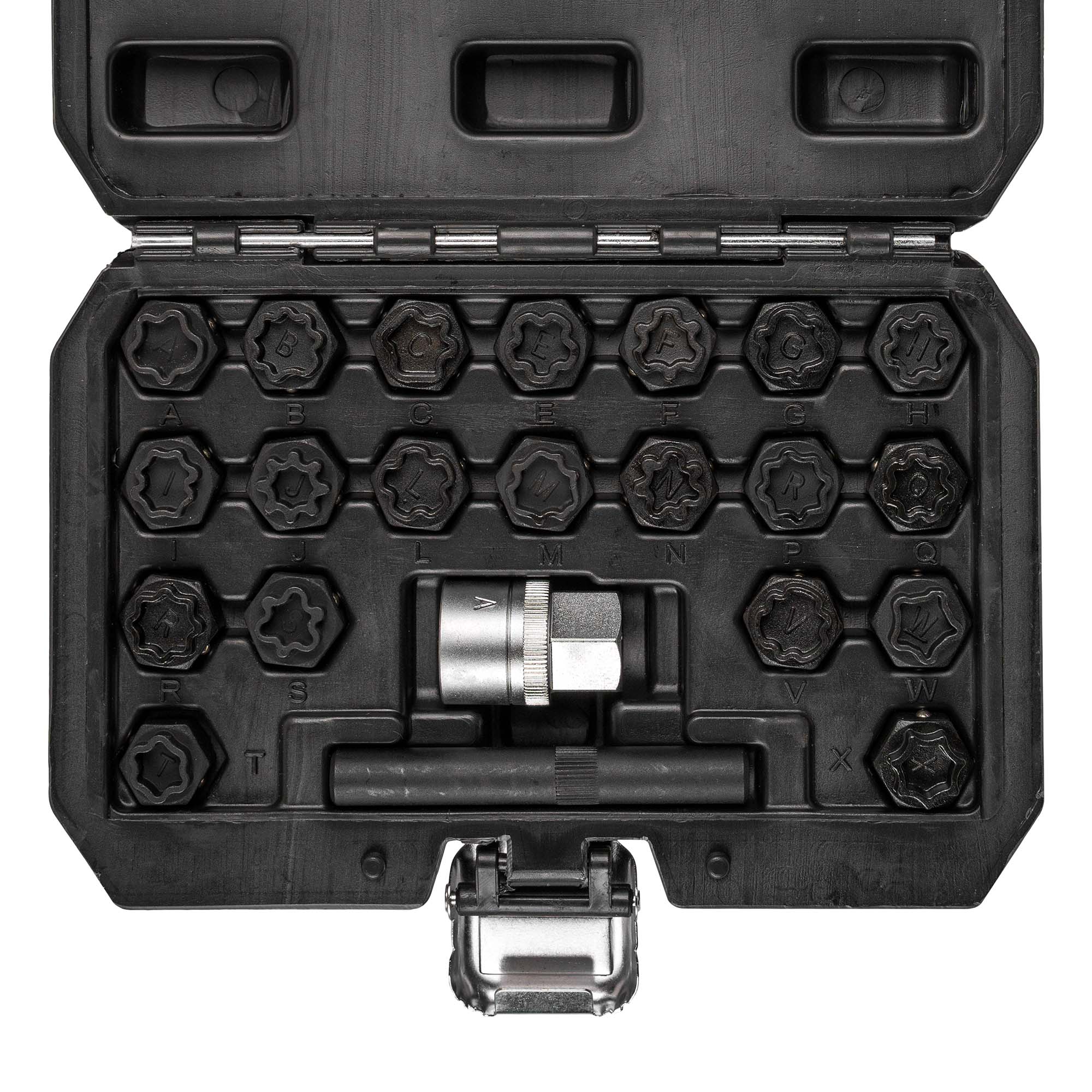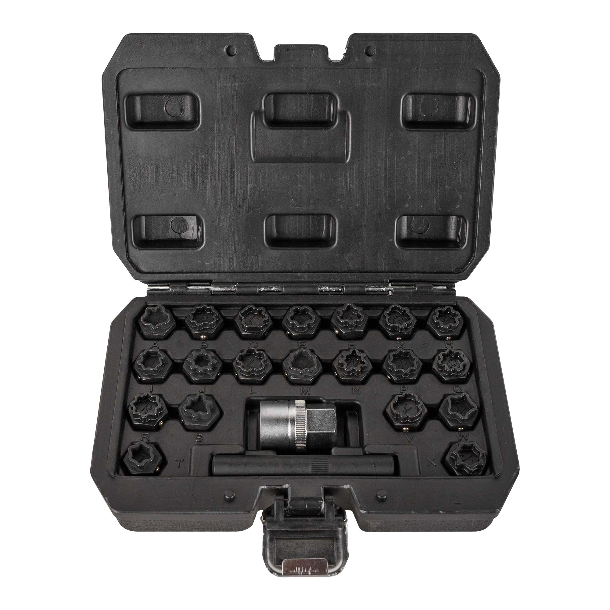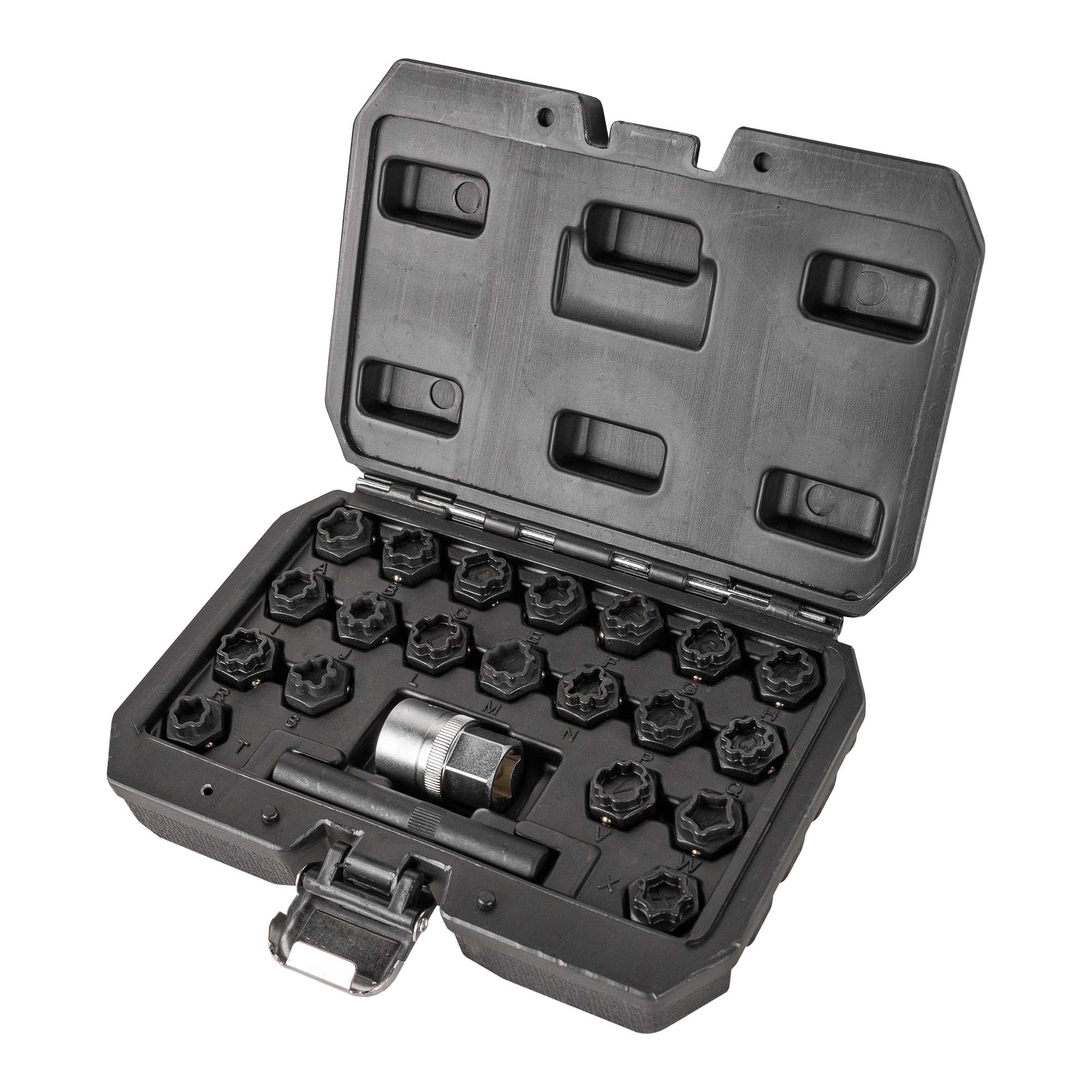 Set especialmente diseñado para extraer los tornillos de seguridad en llantas de vehículos AUDI. Cubren prácticamente el 100% de la flota de vehículos Audi 2002-2012 del mercado. Sirve para el 100% de vehículos con tornillo antirobo tipo «flor».