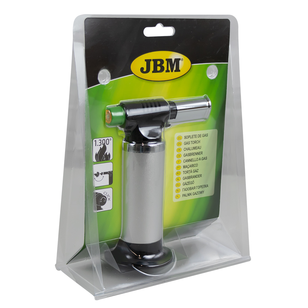 Alcanza los 1.300ºC Tiene dos tipos de llamas Recambio de gas disponible (ref. 51986) Peso: 177g Material: Acero inoxidable +ABS Medidas: 10.1×16.2×13.8cm Temperatura máxima: 1.300ºC servido sin carga de gas. Recambio de gas disponible: ref. 51986